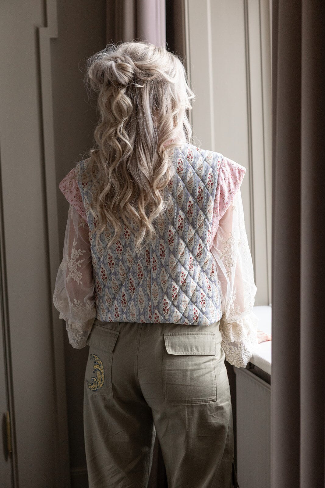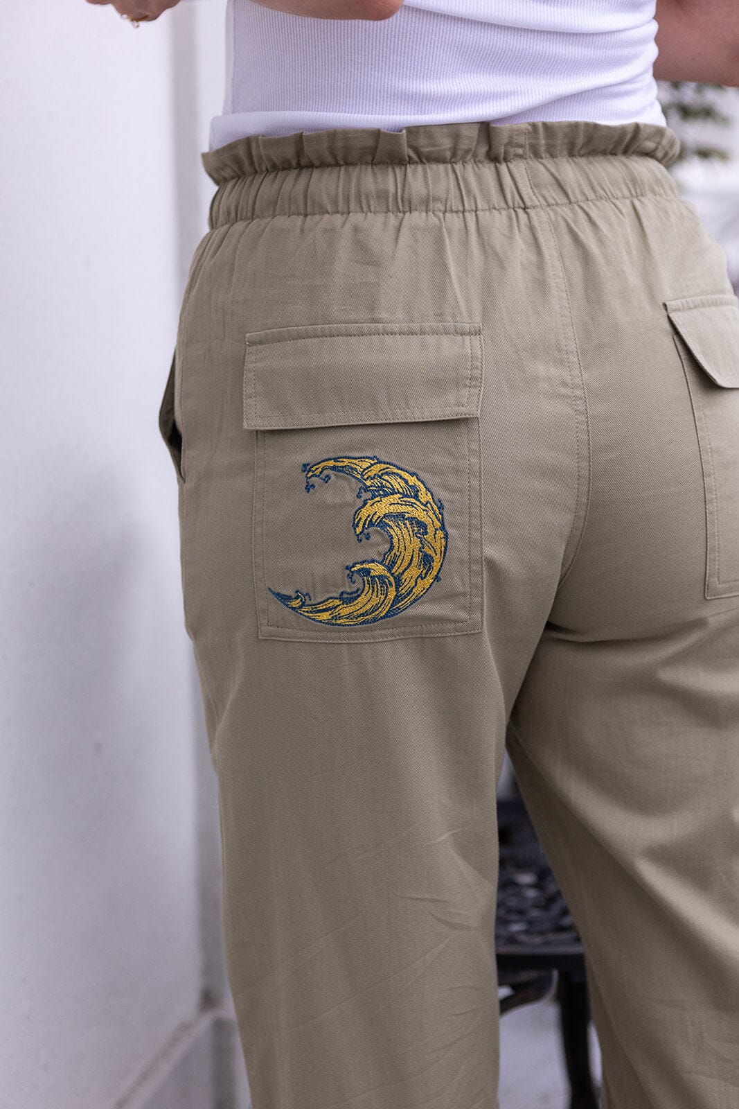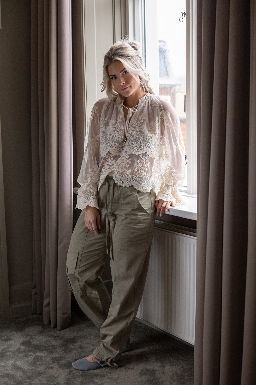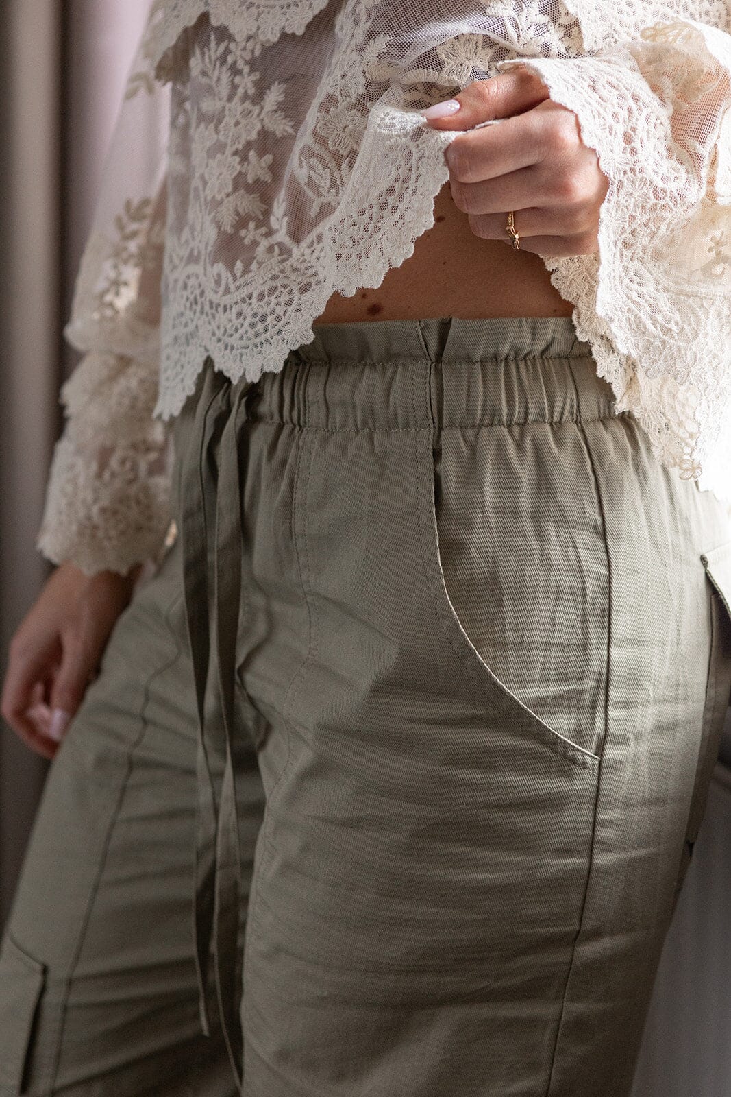 Løse bukser fra Molly & My X Melanie Due i en dempet grønn nyanse. Buksene har høy midje og gulvlengde med detaljer som broderi og volanger.
