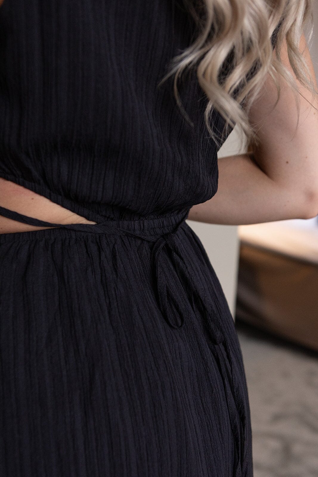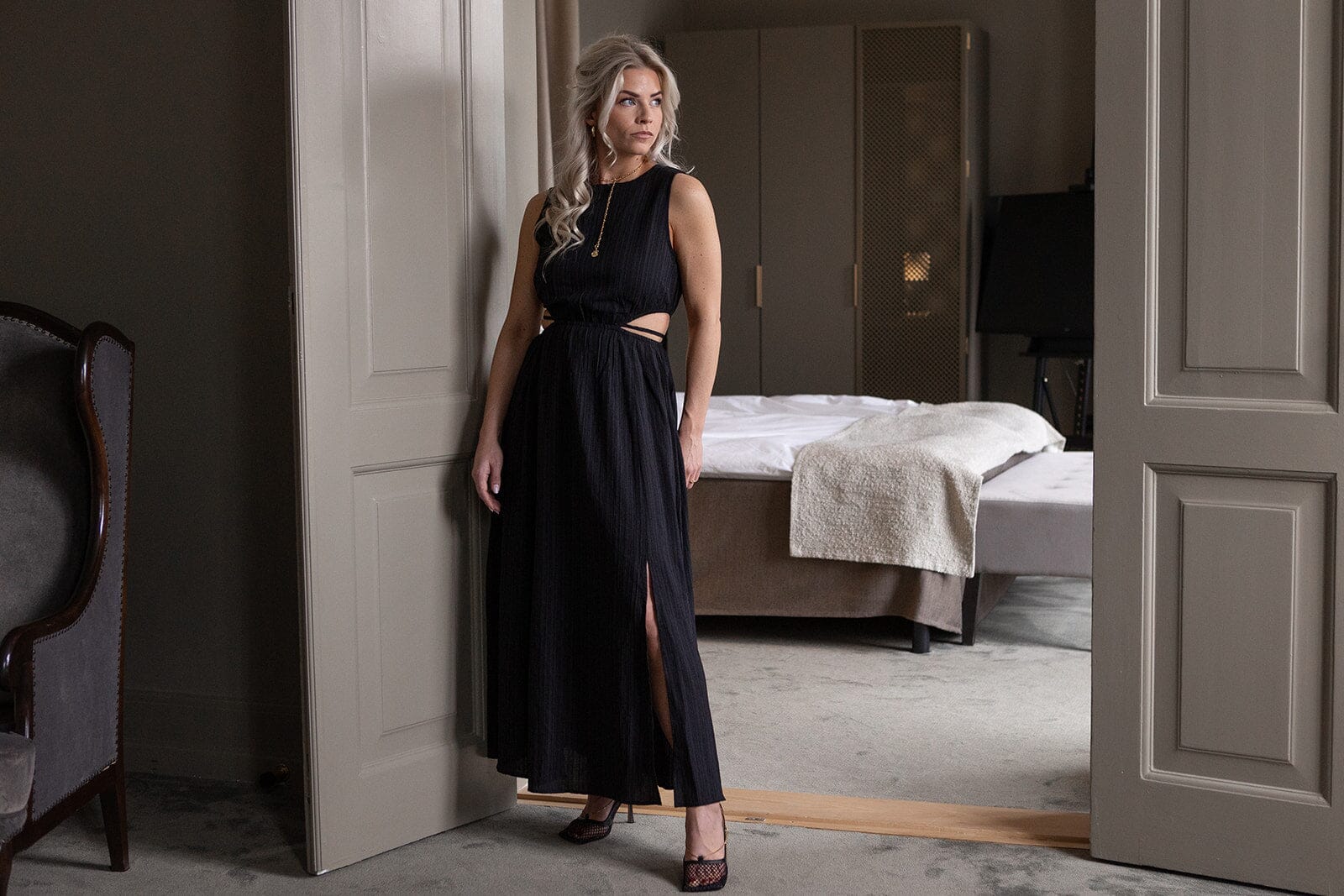 Sort kjole fra Molly & My X Melanie Due med ermeløst design, utskjæringer i midjen og splitt i siden. Kjolen går til ankelen.