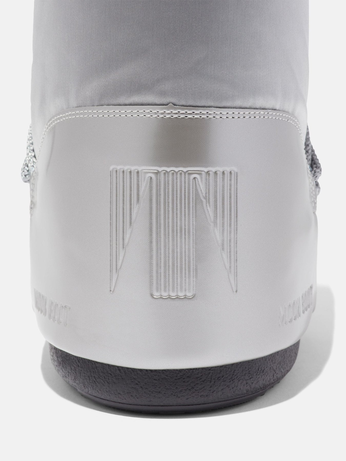 Vinterstøvel fra Moon Boot i sølvfarget satin. Støvelen har en skinnende overflate og en solid gummisåle som gir godt grep på glatte overflater.