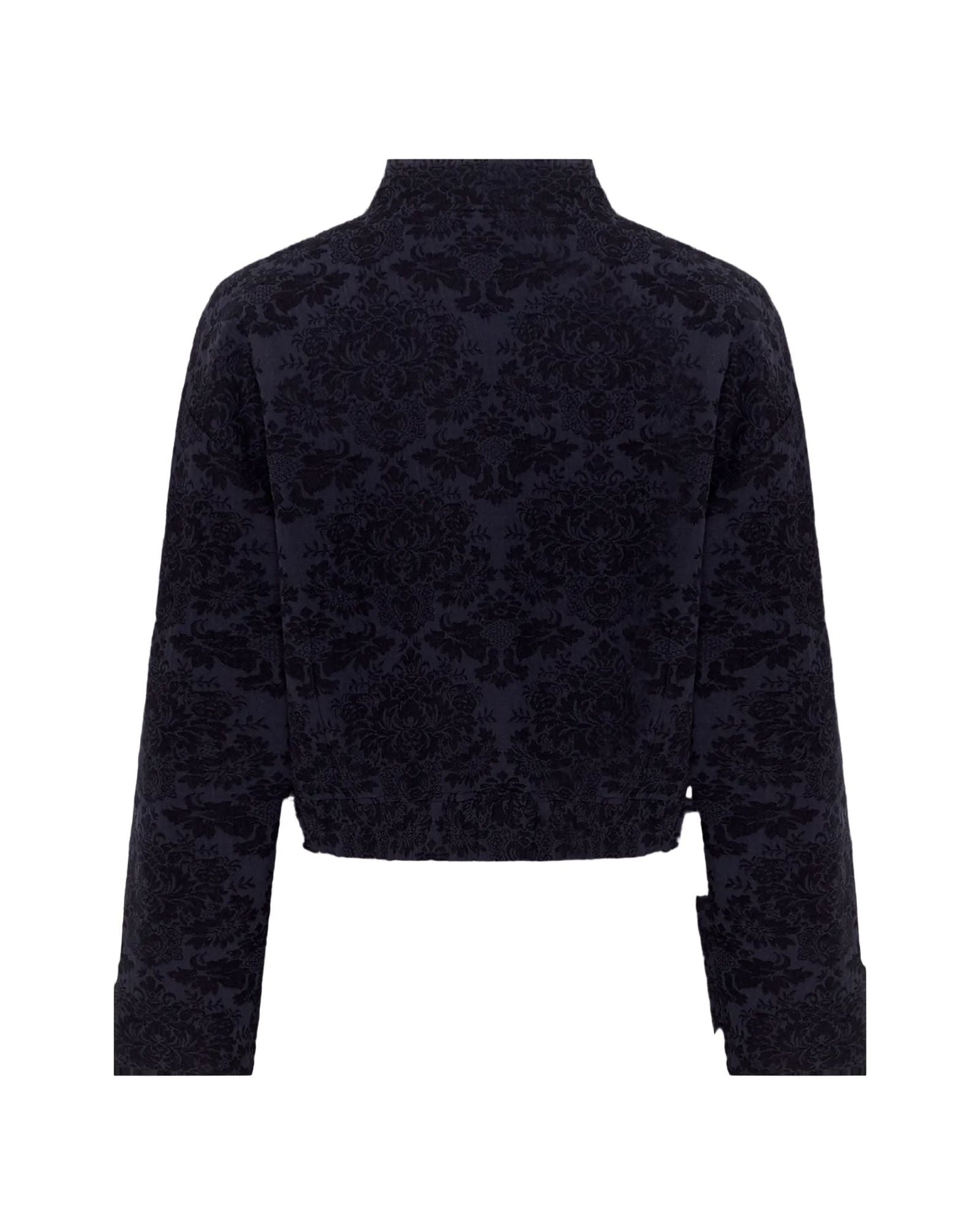 Jakke fra Moss Copenhagen i en mørkeblå nyanse med et blomstrete mønster over hele stoffet. Jakken har lange ermer og en stående krage.