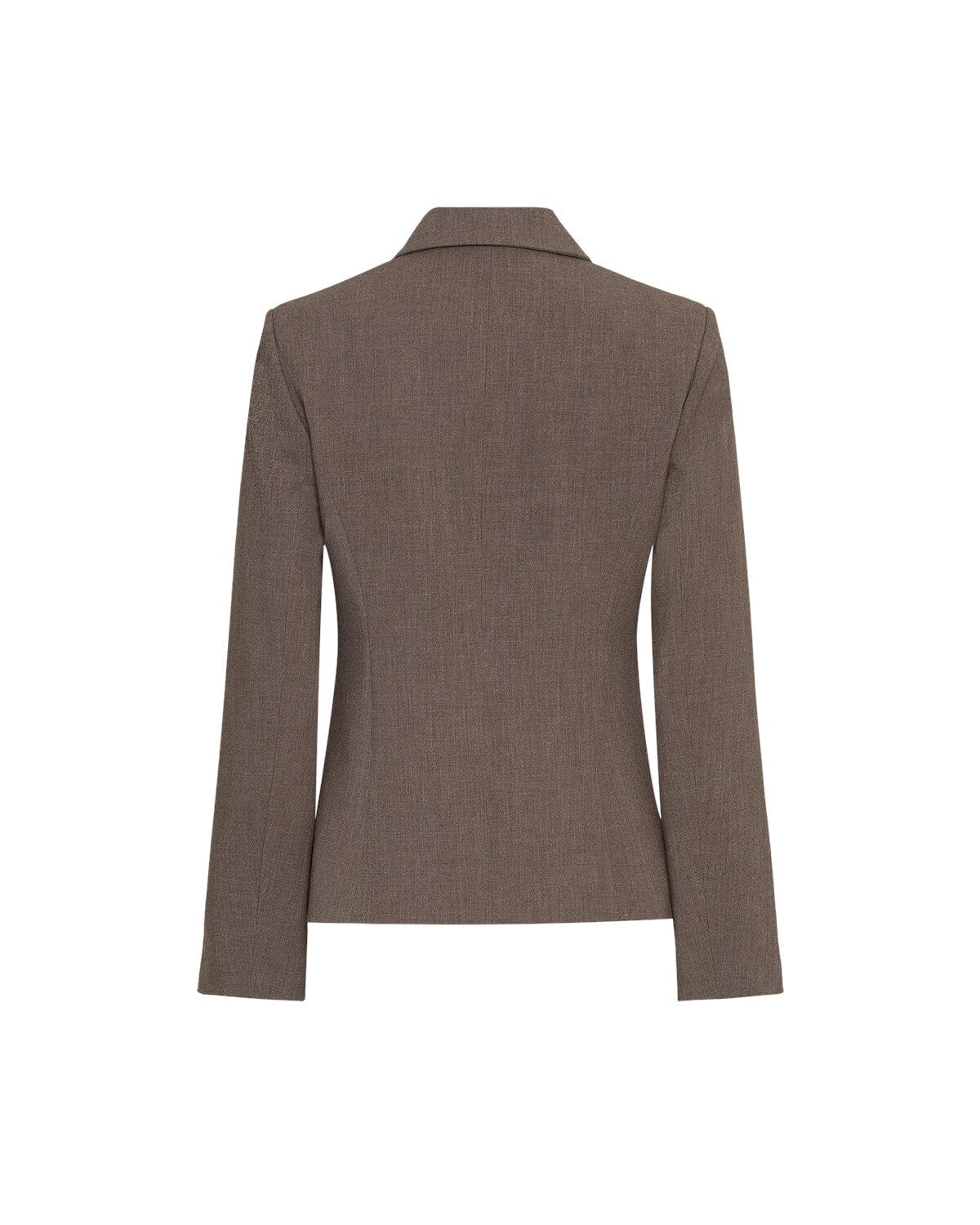 Blazer fra Moss Copenhagen i mørkegrå melert nyanse. Blazeren har klassisk krage, lange ermer og frontlommer med klaff.