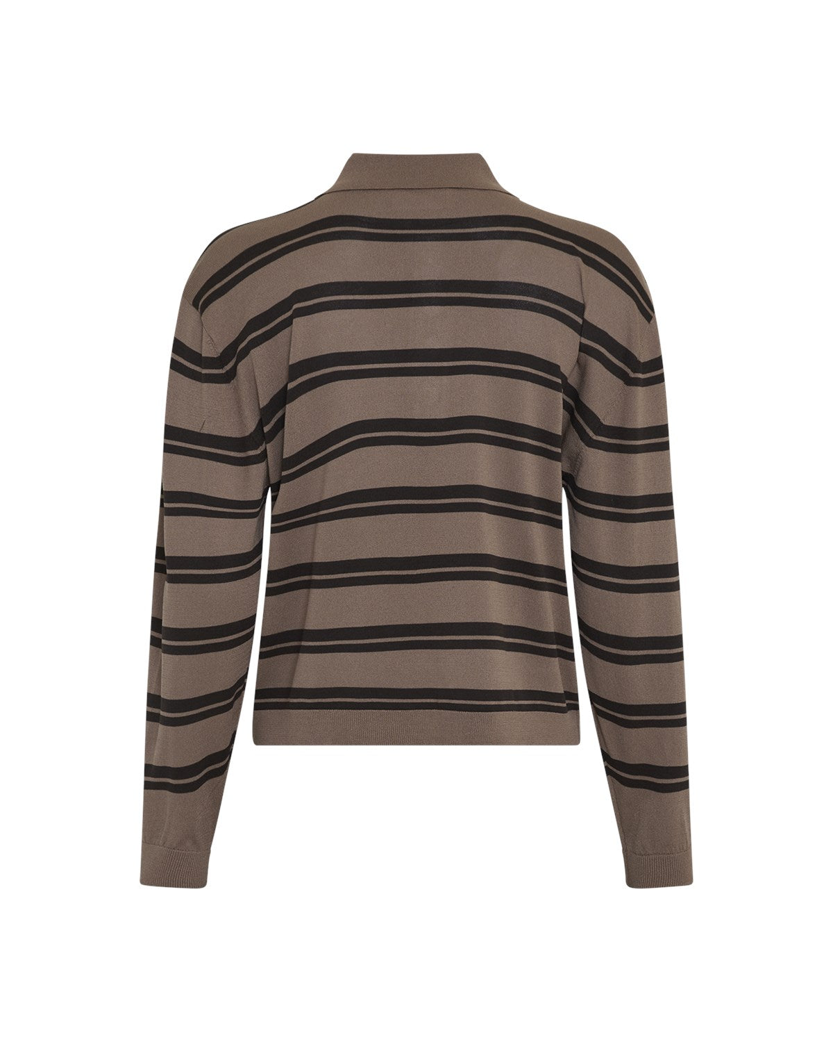 Stripet pullover fra MSCH Copenhagen i brune og svarte nyanser. Pulloveren har polokrage, knappelukking foran og lange ermer.