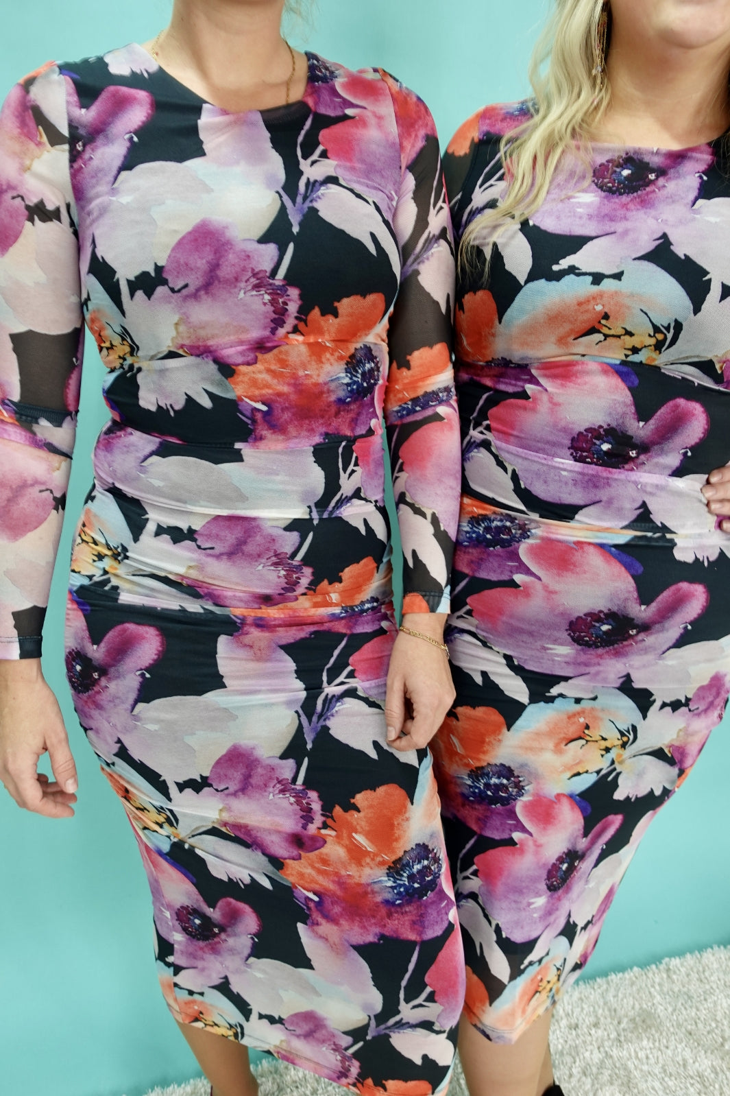 Super sød midi kjole i det flotteste print, med rynke effekt i siden.