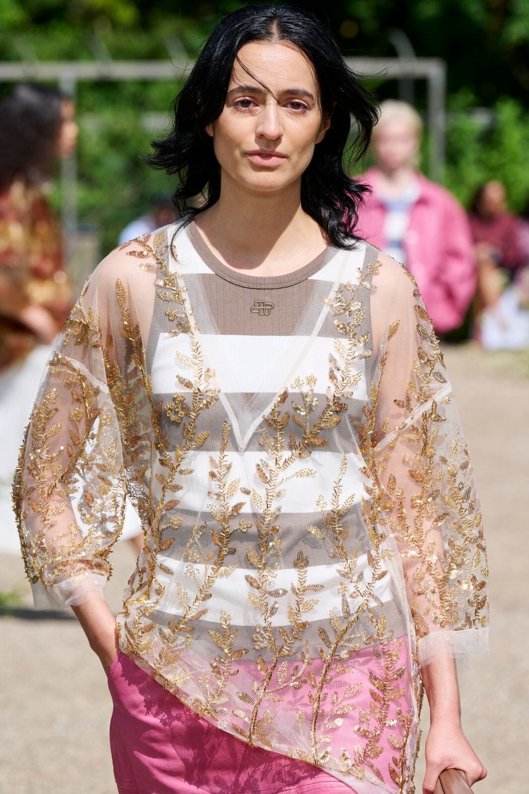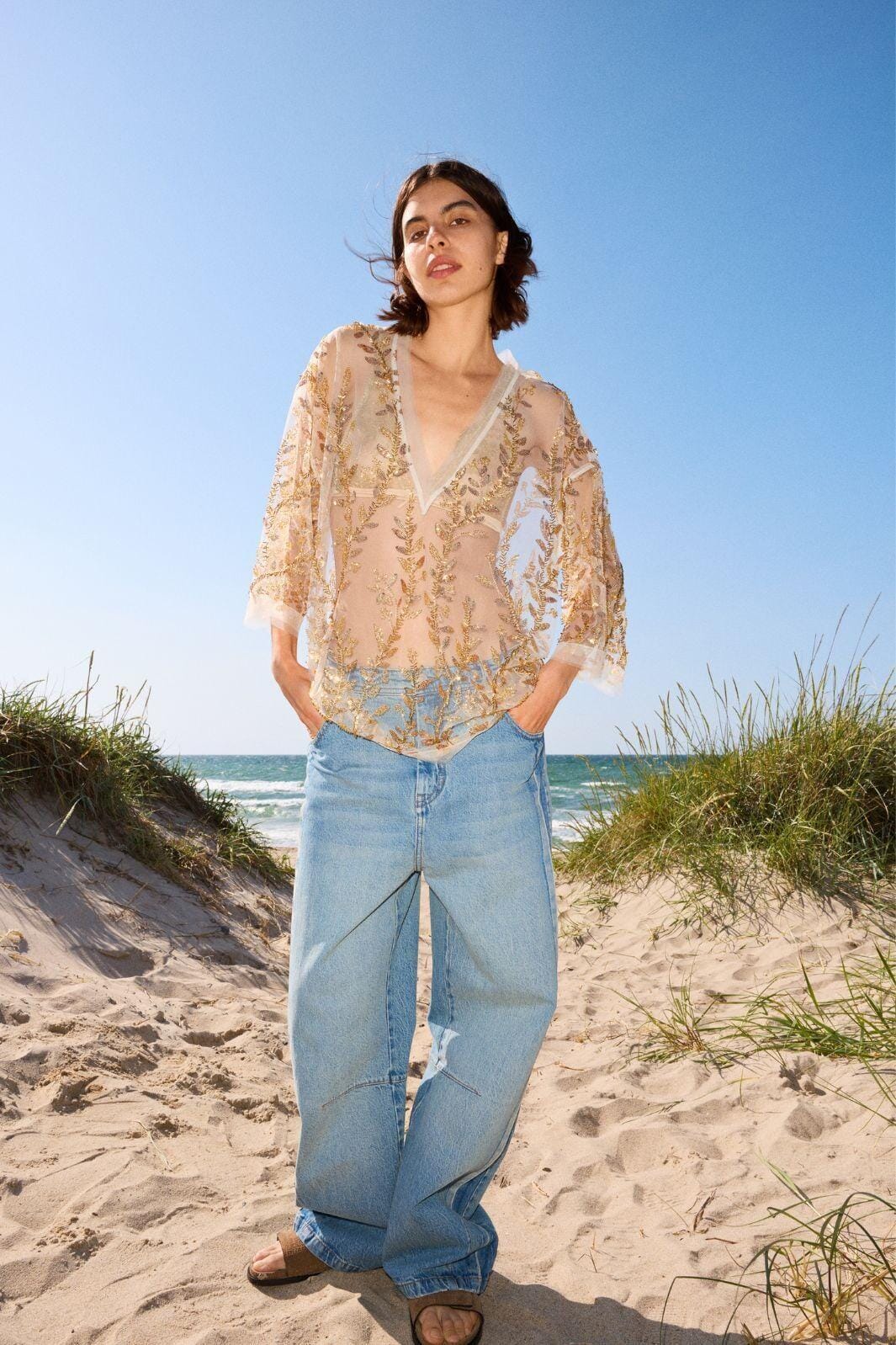 Gylden topp fra Munthe, laget av transparent polyester med gyldne broderier, paljetter og perledetaljer i et bladmønster over hele toppen.