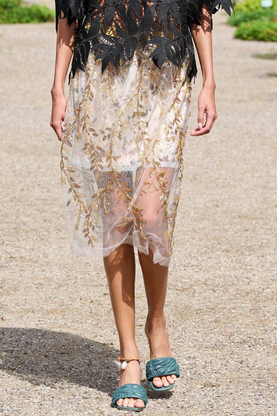 Transparent skjørt fra Munthe med gullbladbroderi. Skjørtet er laget av et lett, transparent materiale med detaljert broderi i gullnyanser med bladmotiv.