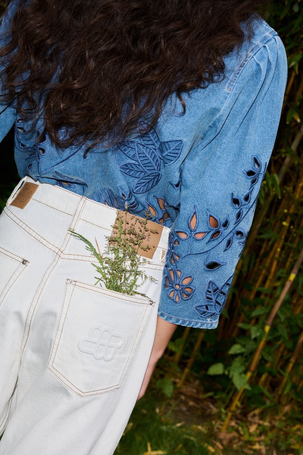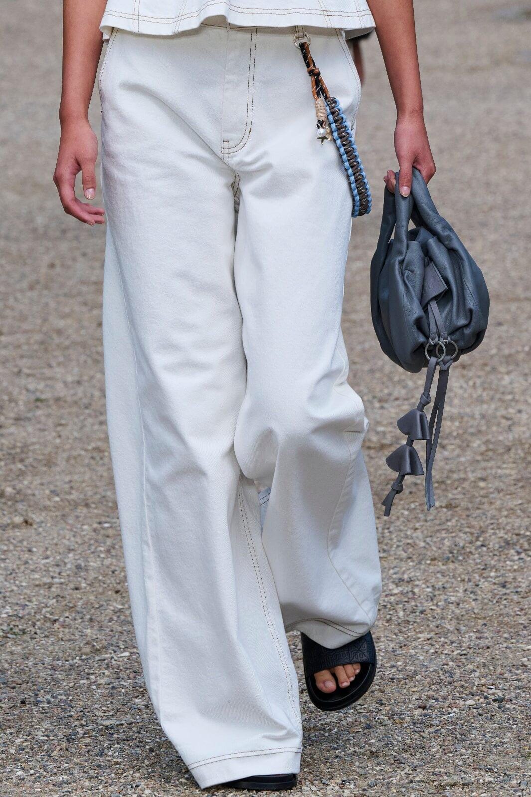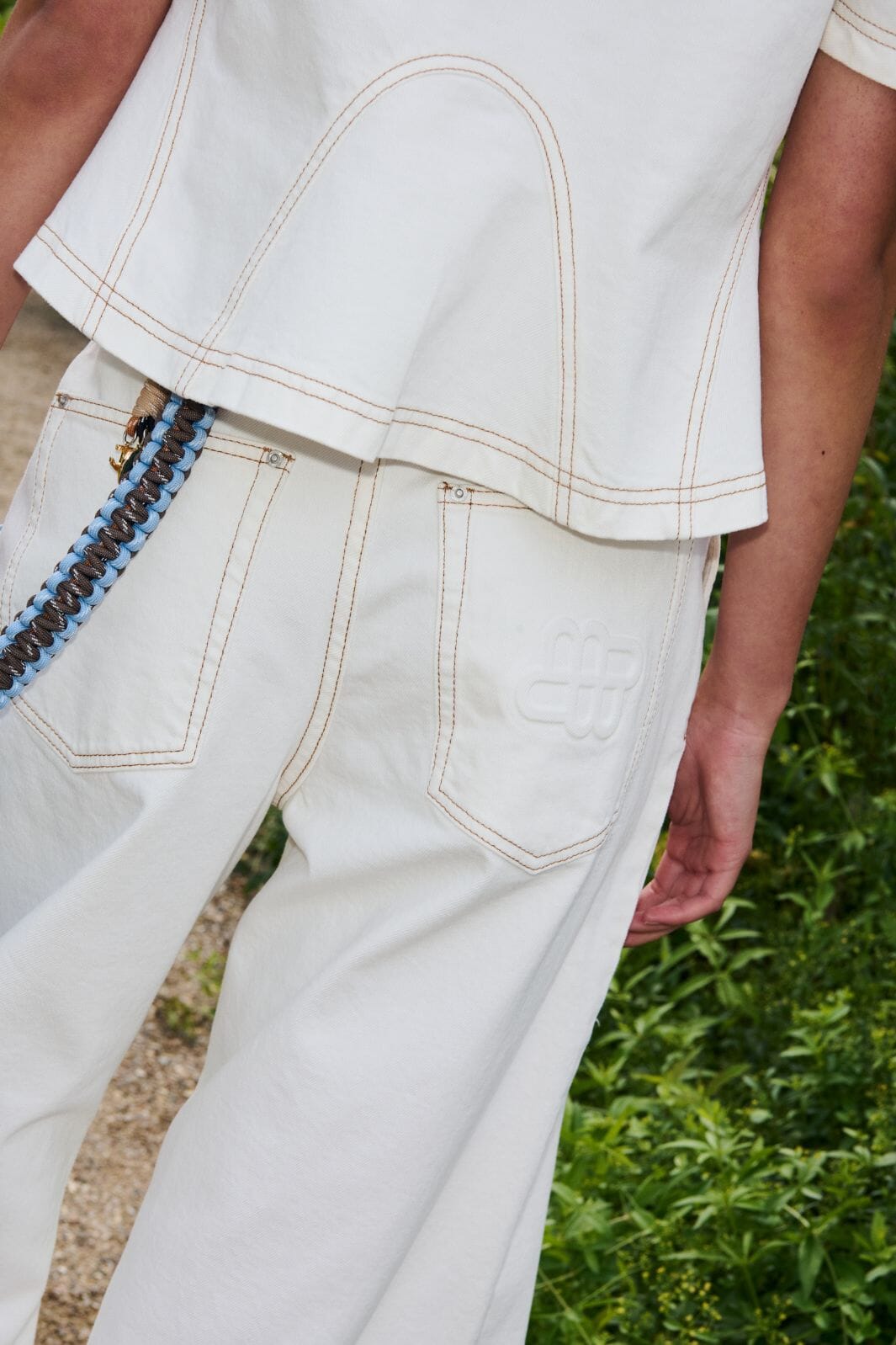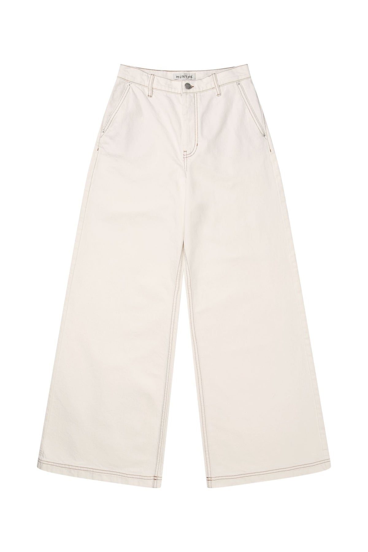 Bukser fra Munthe i en lys elfenbensfarge. De er laget av 99 % økologisk bomull med 1 % elastan.