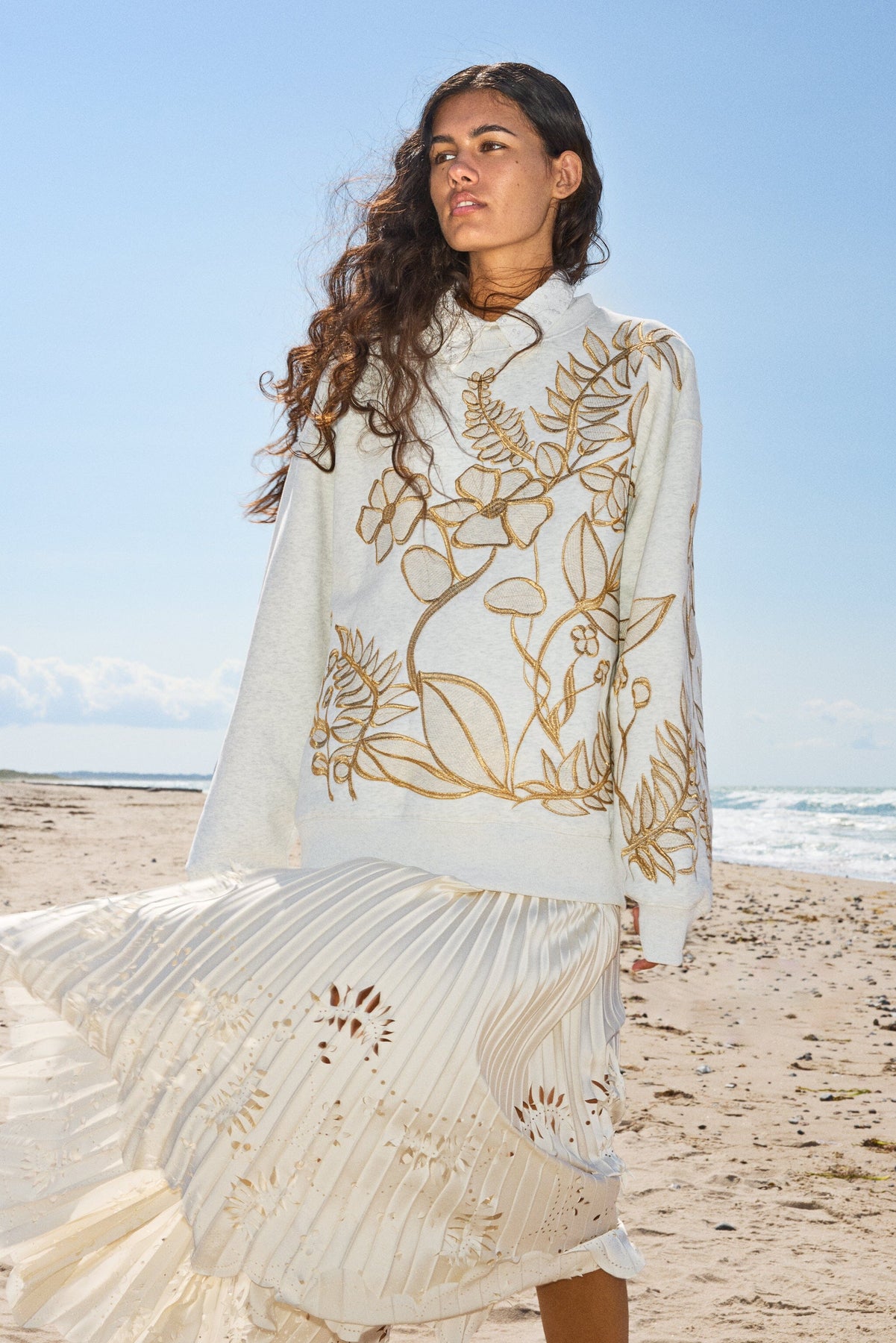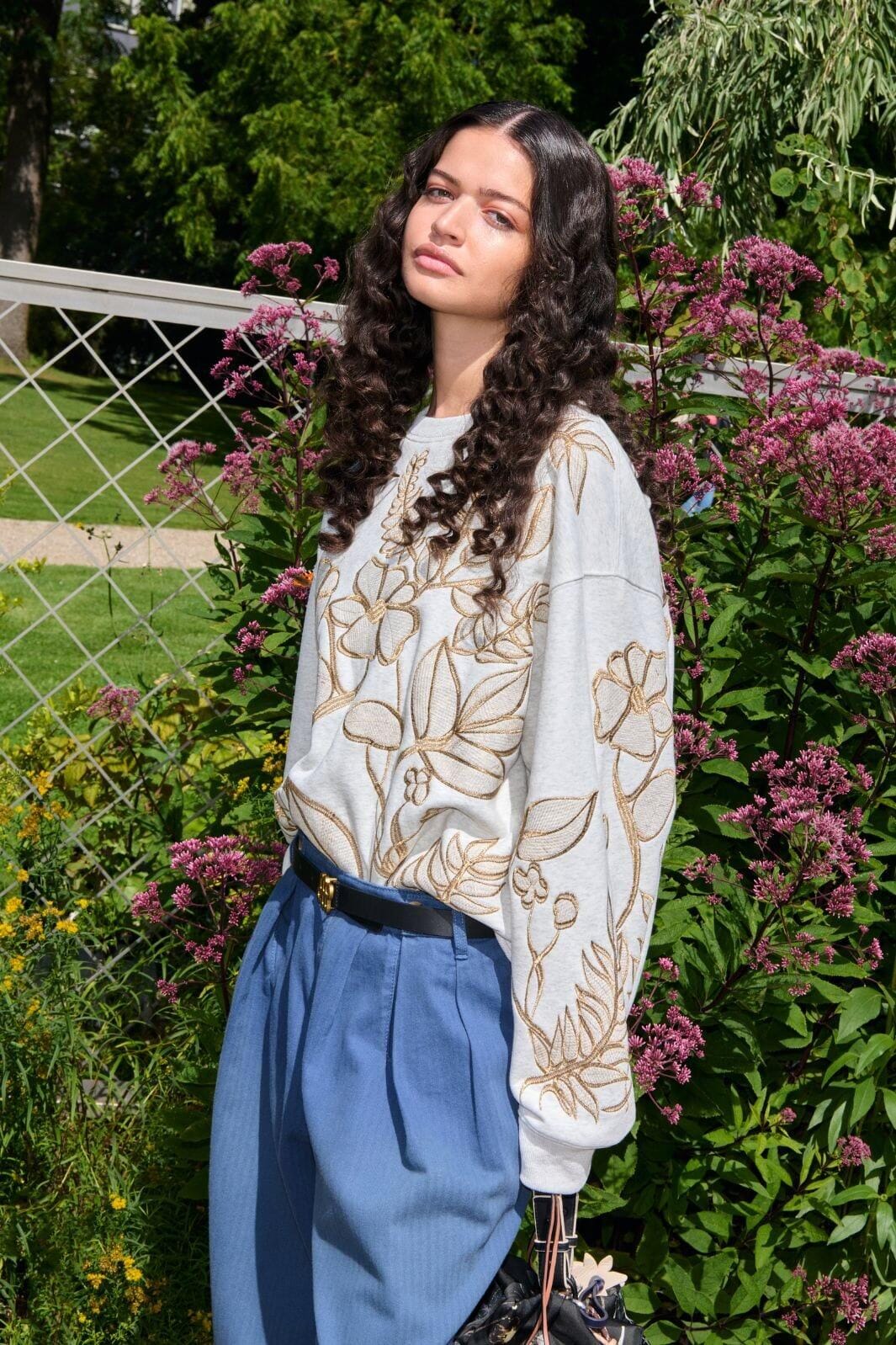 Lys grå sweatshirt fra Munthe med blomsterbroderi i gulldetaljer på forsiden og ermene. Oversized passform med rund hals og lange ermer.