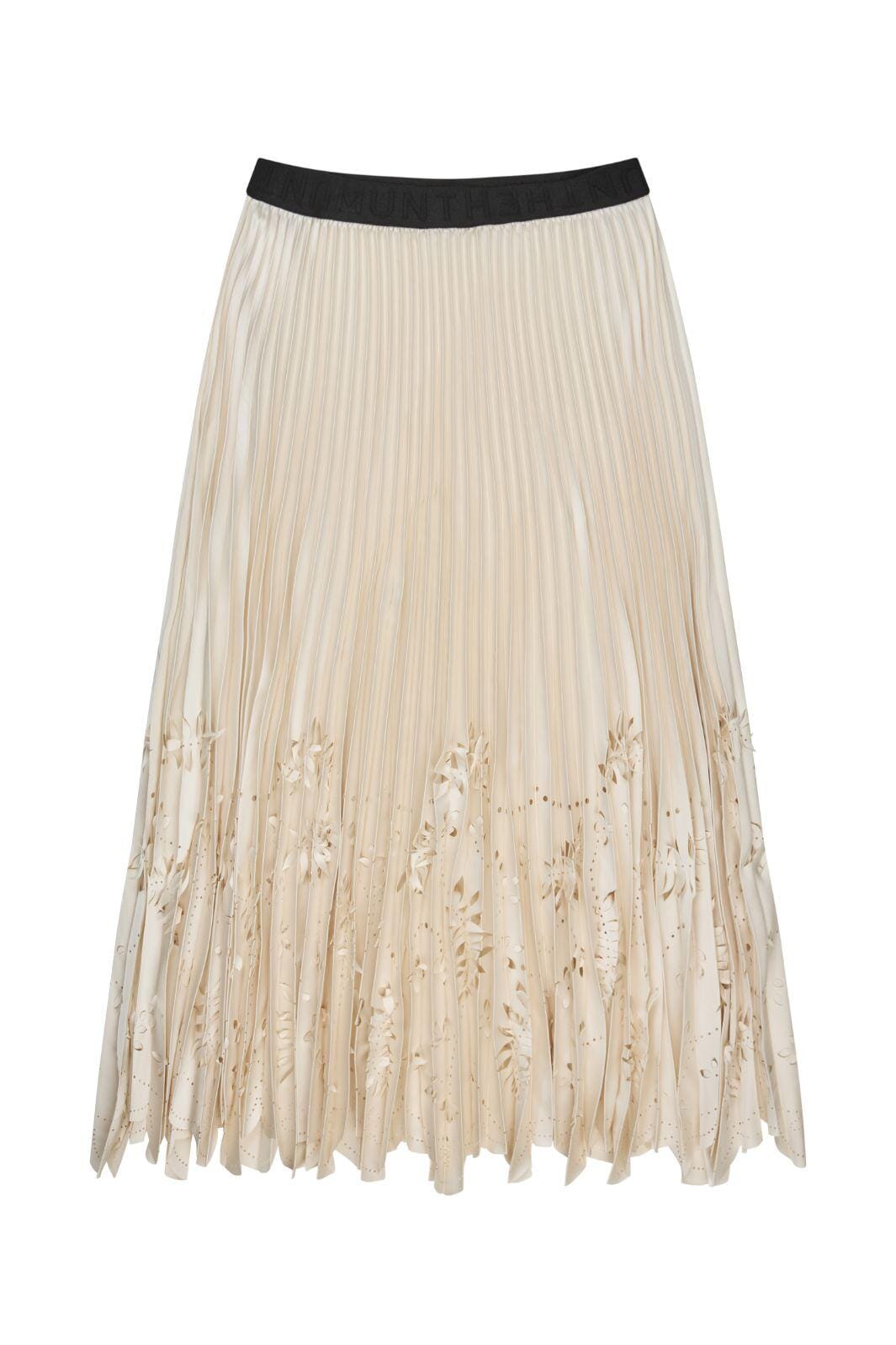 Plissert skjørt fra Munthe i en kremaktig offwhite nyanse. Skjørtet er laget av 100 % resirkulert polyester og har laserskårne blomsterutskjæringer i den nederste delen.