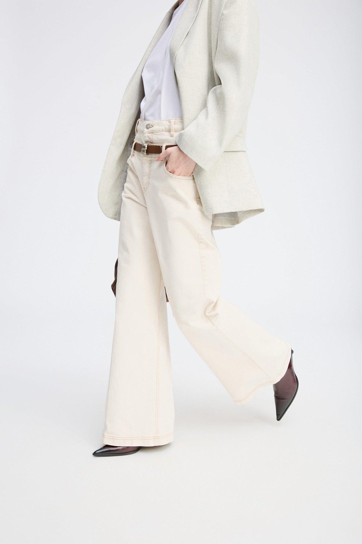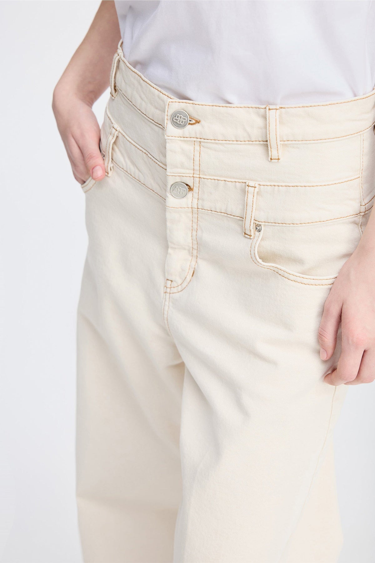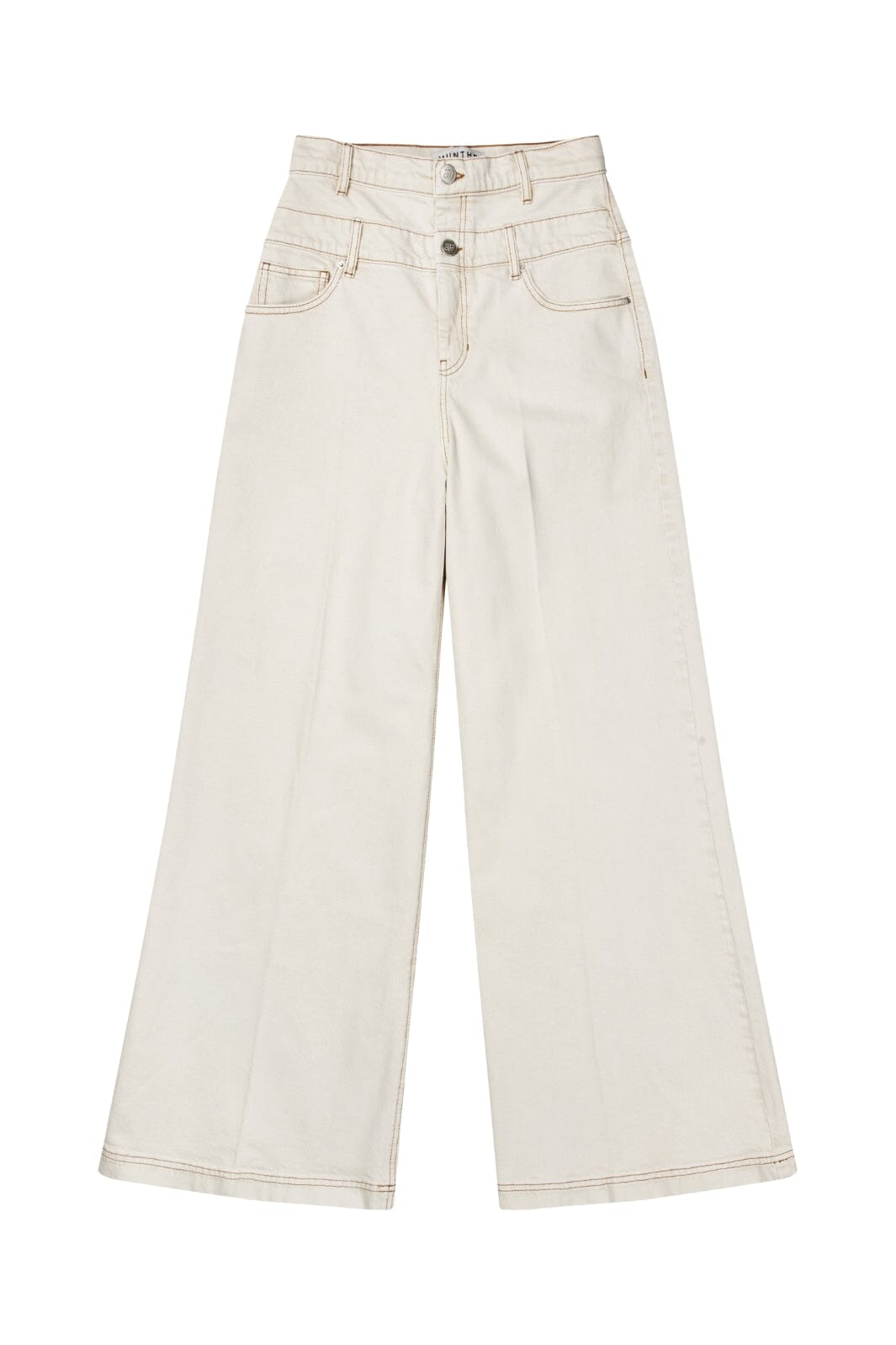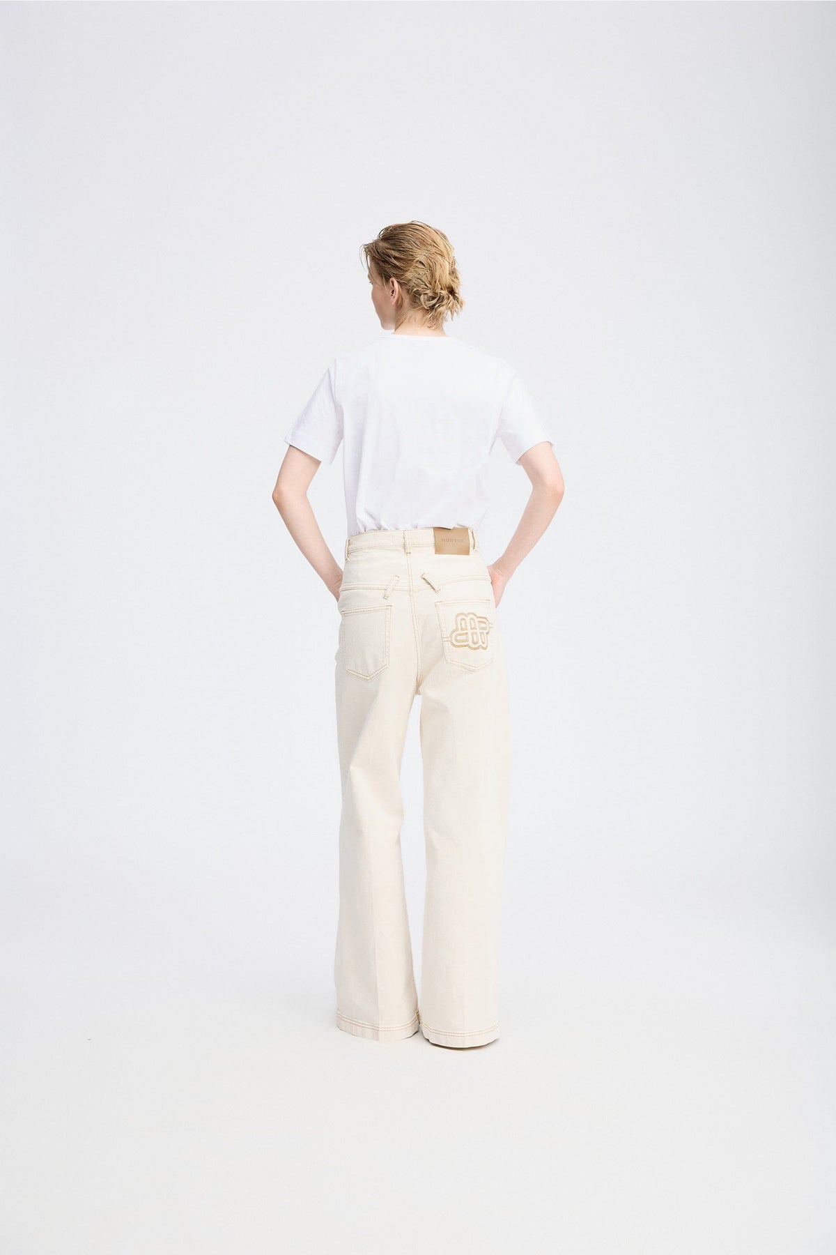 Høytlivsbukser fra Munthe i råhvit denim. Buksene har vide ben og dobbel knappelukking foran. Et brodert emblem pryder baklommen.