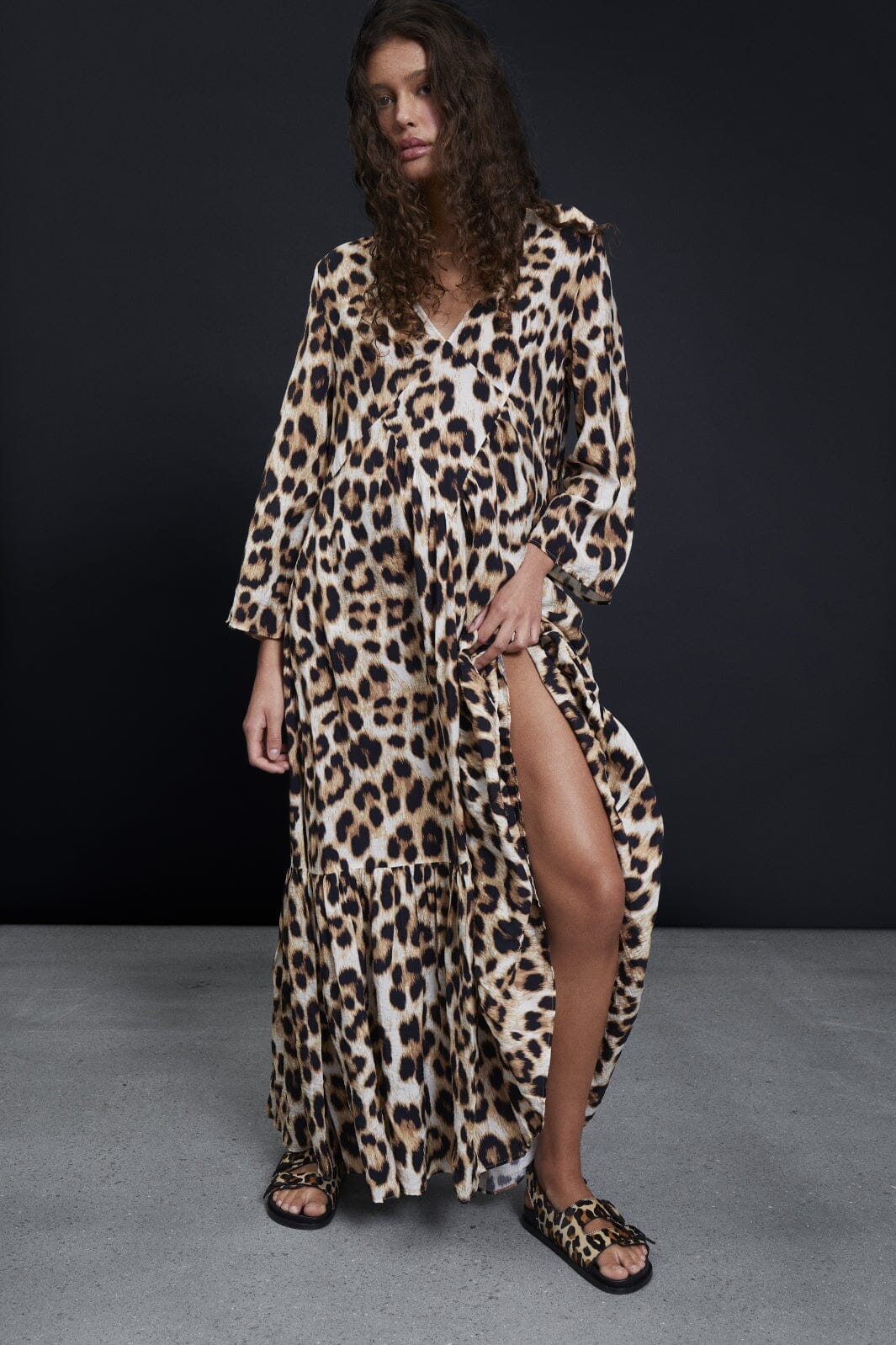 Lang kjole fra Munthe i mocca-farget leopardprint. Kjolen har en dyp V-utskjæring, bindebånd på ryggen og ruterformet søm foran.
