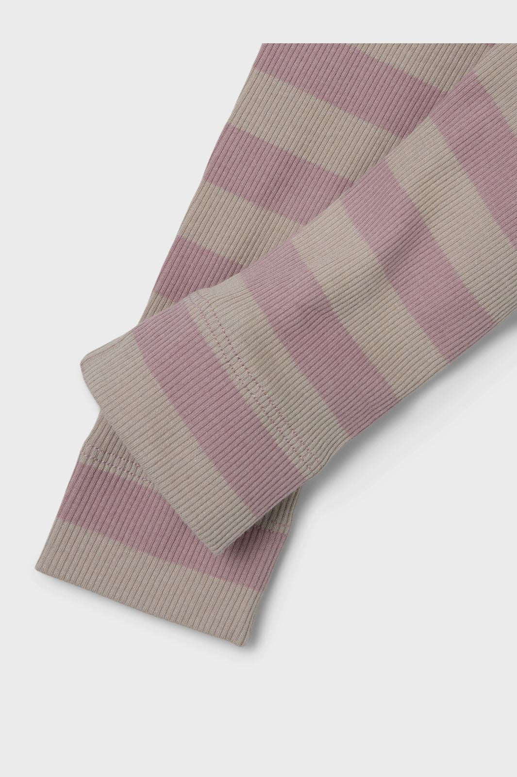 Det ribbestrikkede stoffet med vertikale striper i beige og lys rosa gir leggings et enkelt og tidløst uttrykk.