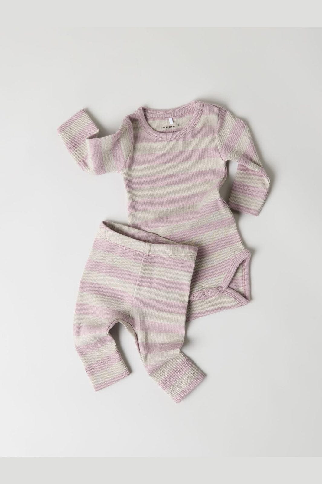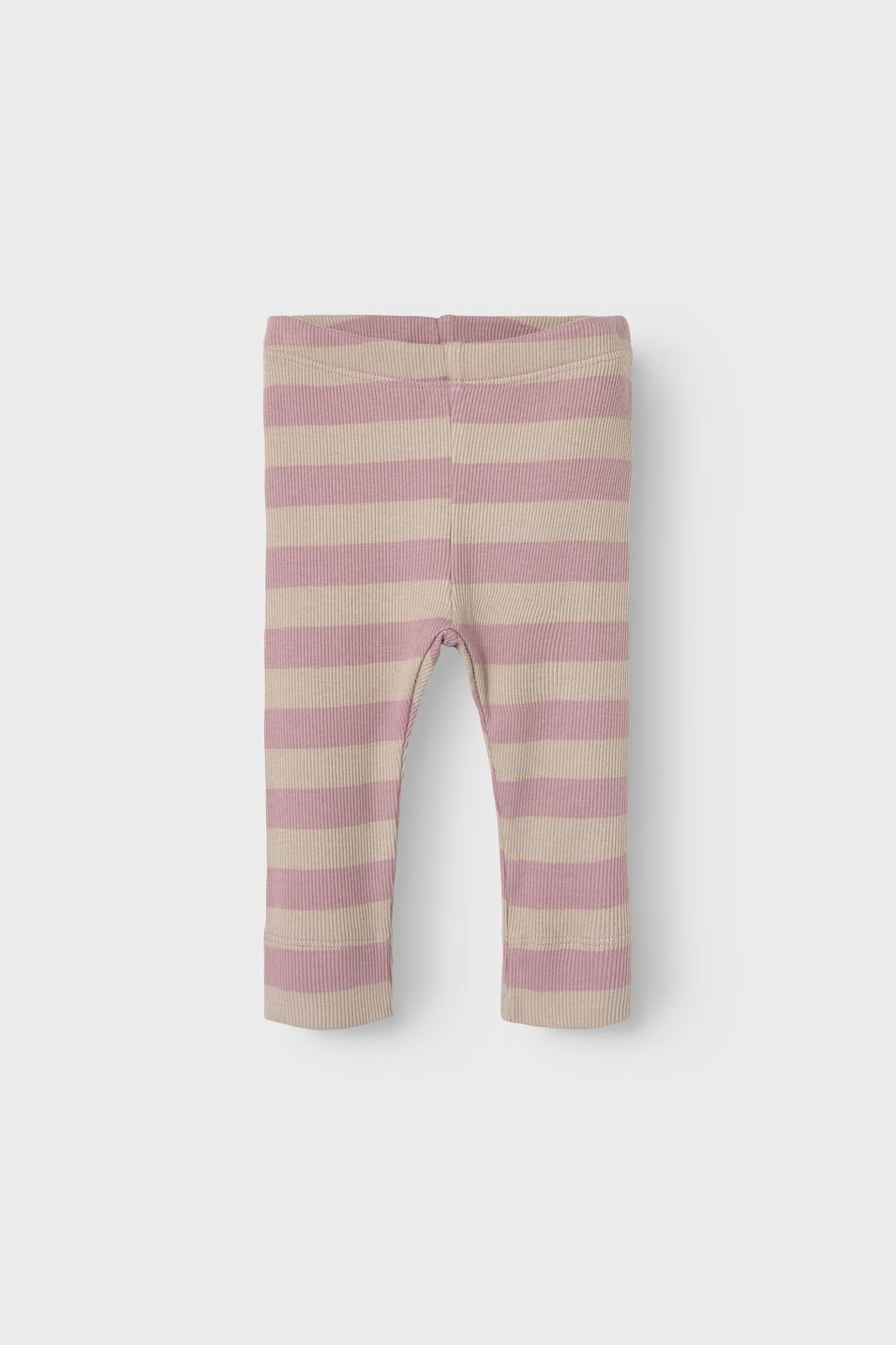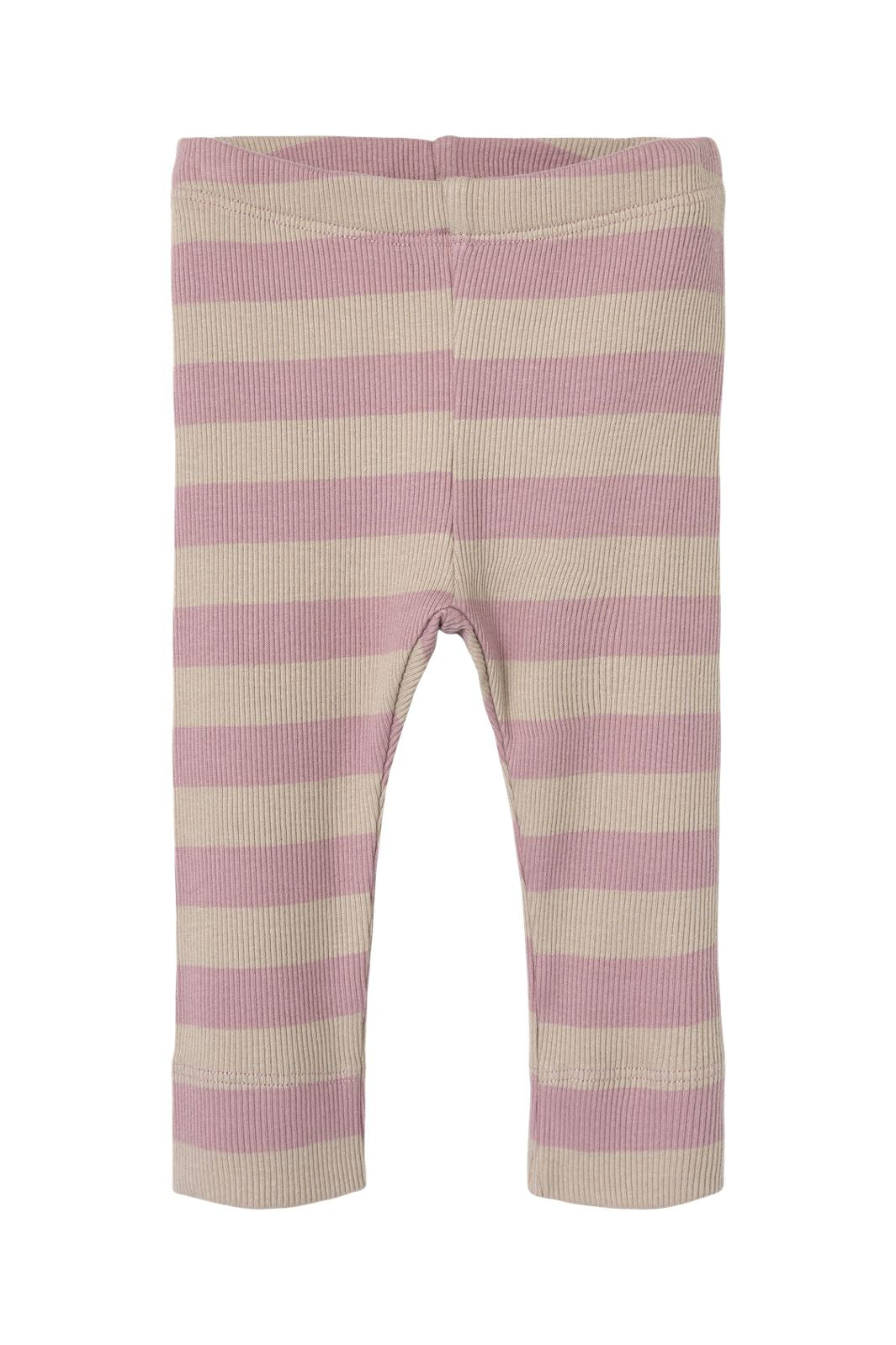 Ribbestrikkede leggings fra Name It med striper i beige og lys rosa. Det tettsittende designet har en elastisk midje og går til ankelen.