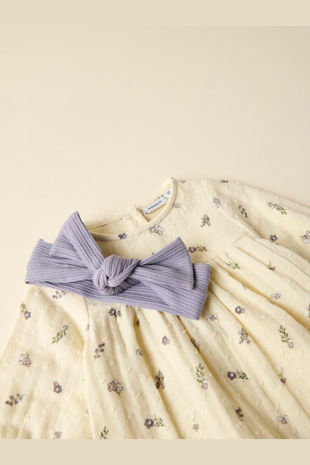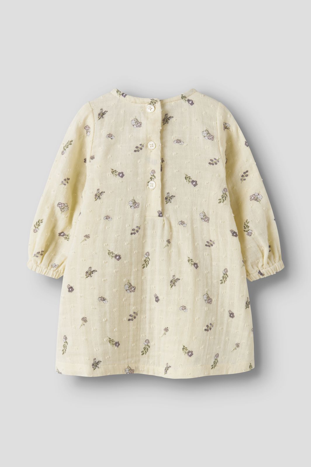 Langermet kjole fra Name It i en lys kremfarget nyanse med småblomstret print. Kjolen er laget av 100 % økologisk bomull i musselin.