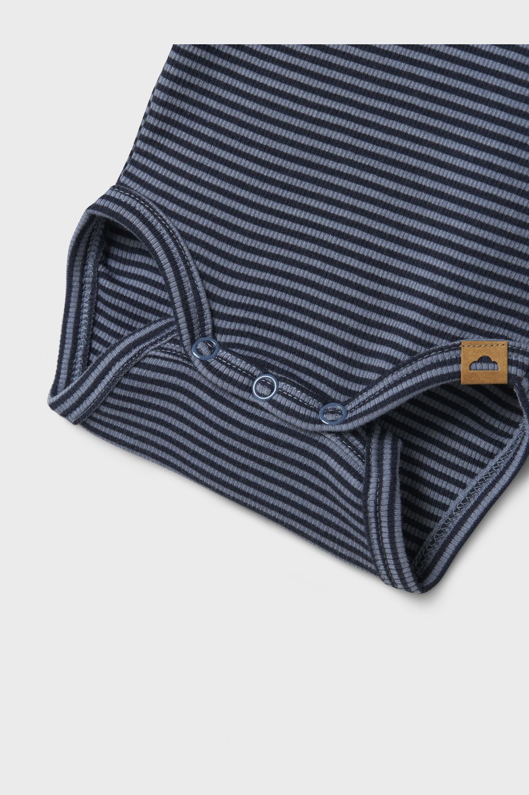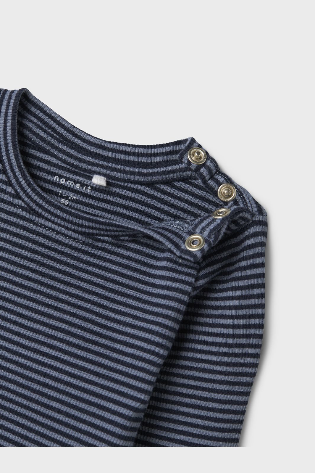 Stripet body fra Name It i mørkeblå og blå. Laget i økologisk bomull med ribbestrikk, som gir et stripet mønster. Den har rund hals og lange ermer med oppbrett ved mansjettene.