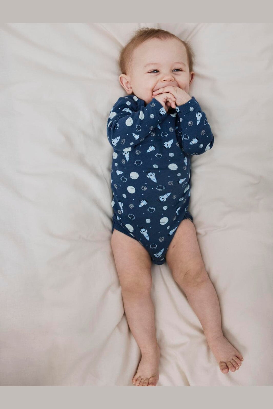 Langermet body fra Name It i mørkeblå med romtema. Bodyen finnes også i ensfarget lyseblå. Begge variantene har trykk med raketter og planeter eller ensfarget design.