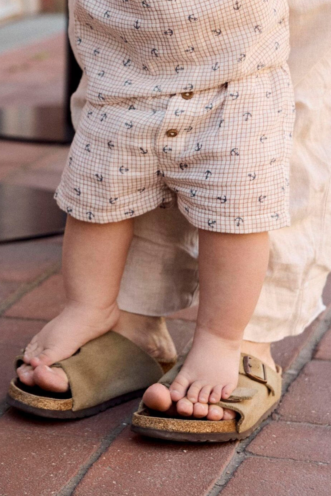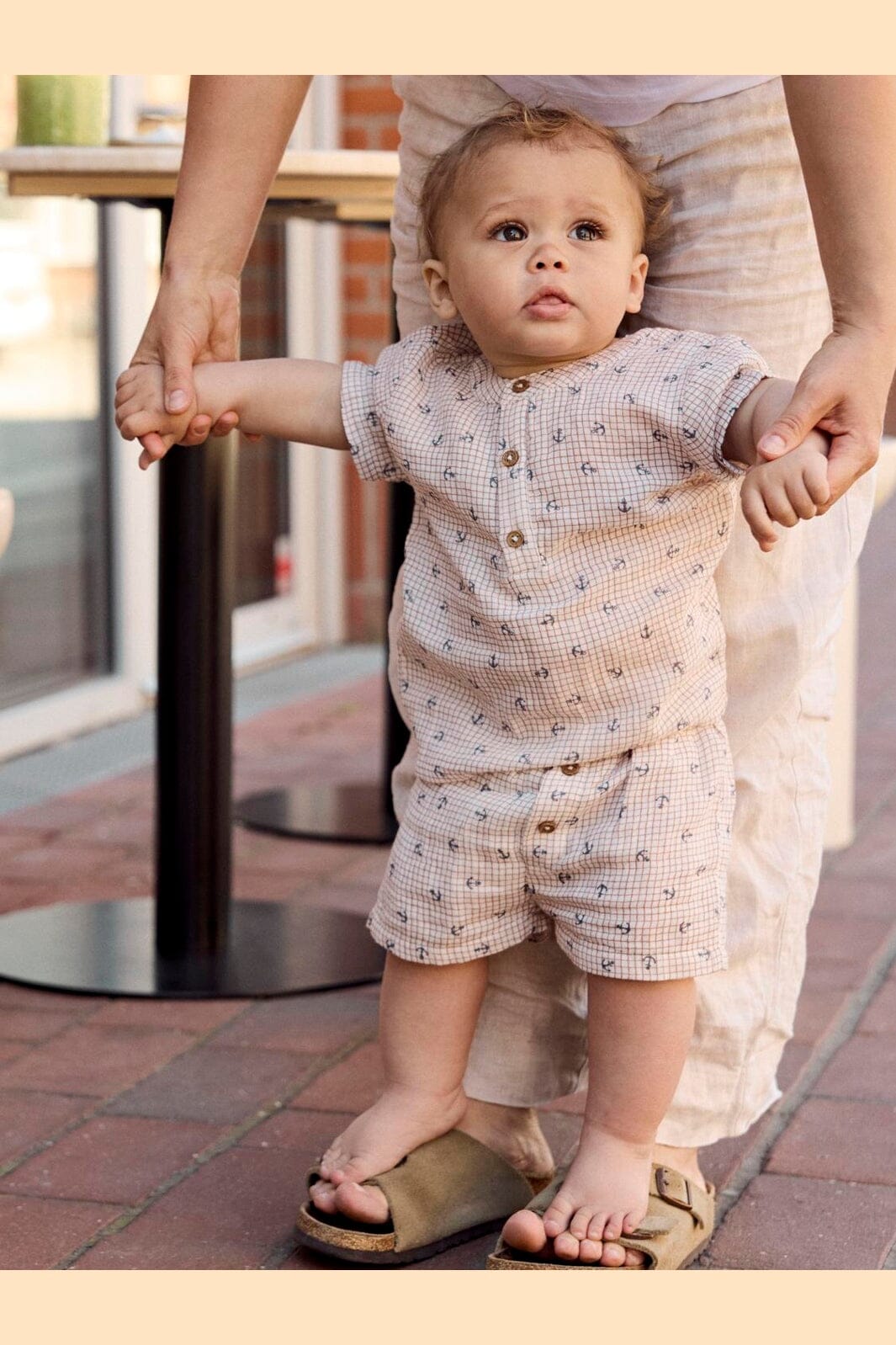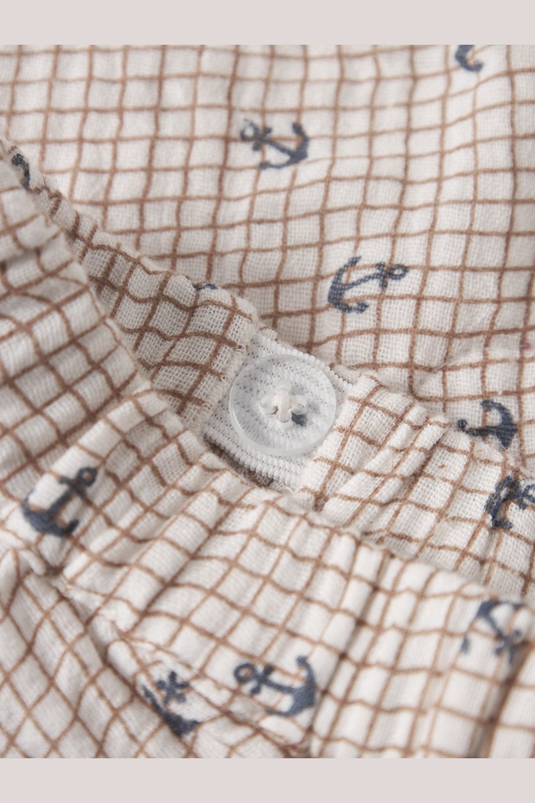 Beige shorts fra Name It i 100% bomull. Shortsen har et rutemønster med små ankerprint og en elastisk midje med knappelukking.