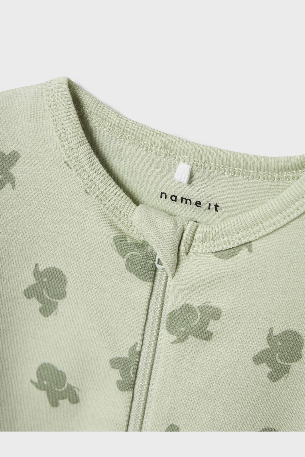 Nattdrakt fra Name It i lys grønn farge med elefantprint. Drakten har glidelås fra hals til ben og er laget av en blanding av økologisk og vanlig bomull.