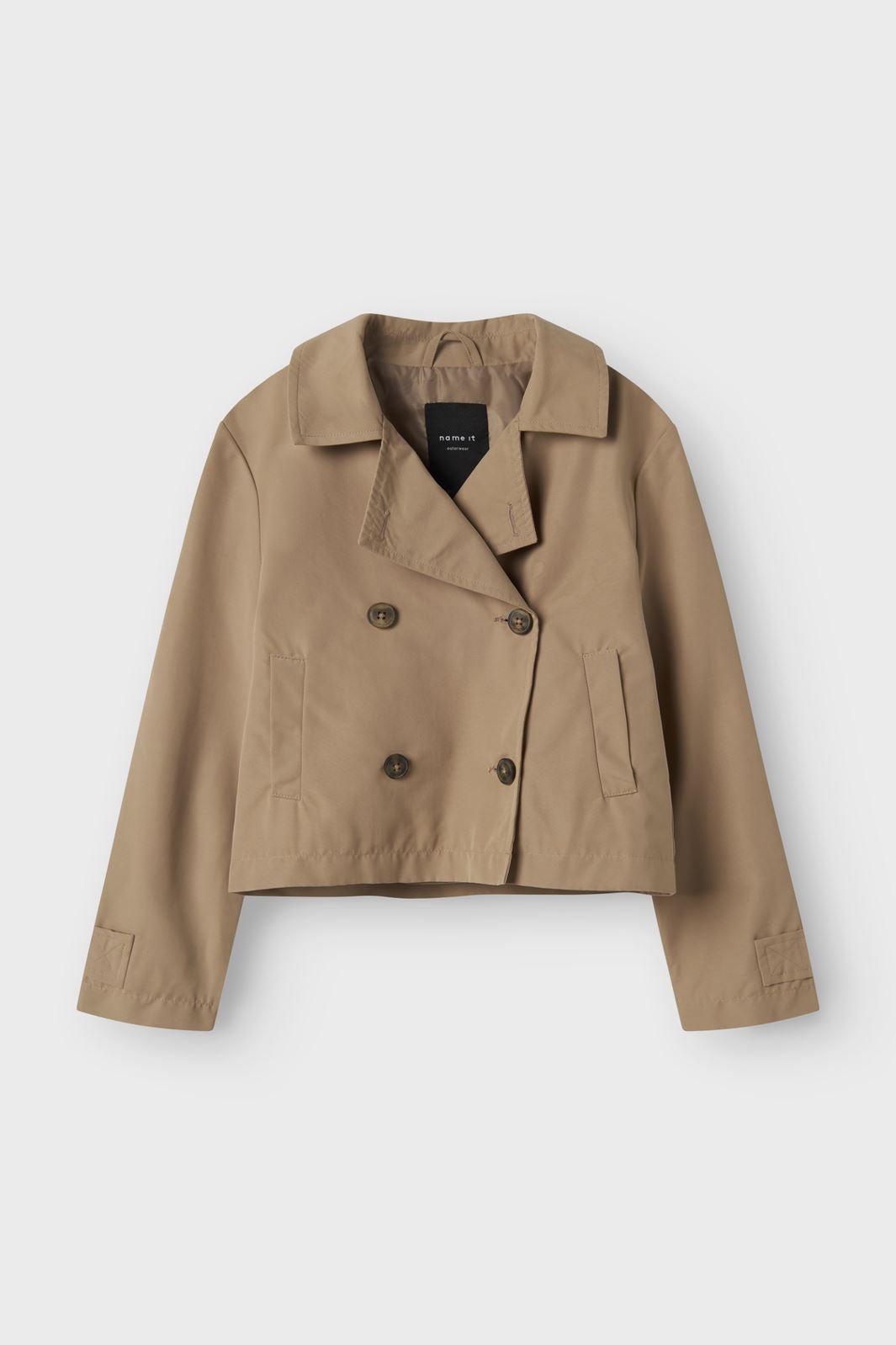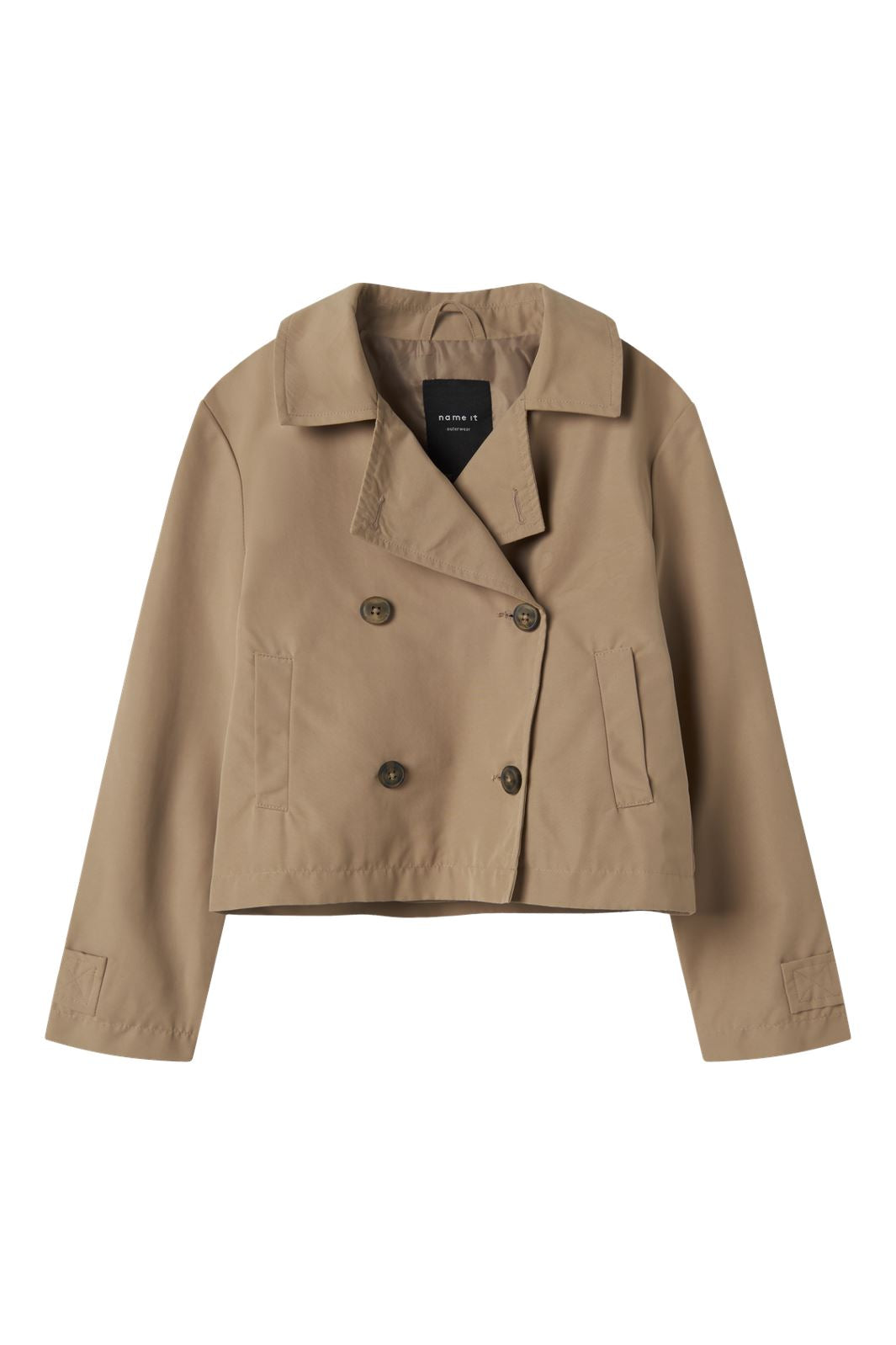 Kort trenchcoat i beige fra Name It med spredt krage og lange ermer. Jakken har klassisk knapplukking foran og praktiske lommer i sidene.