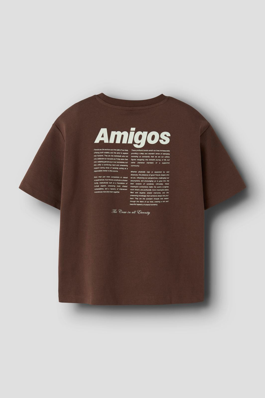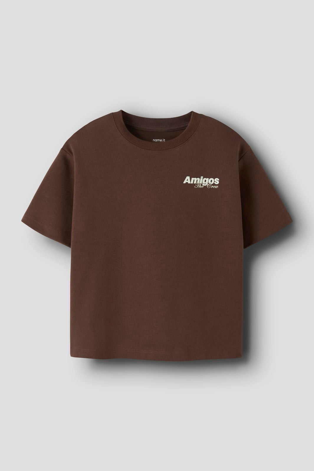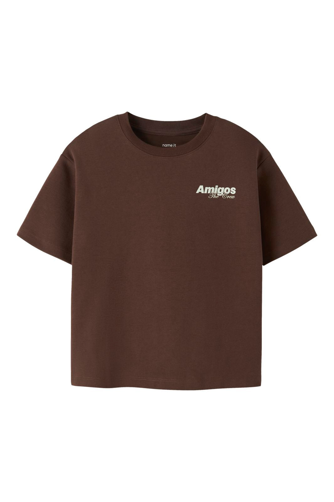Brun t-skjorte fra Name It i en blanding av økologisk bomull og polyester. T-skjorten har en løs passform og et Amigos The Crew-print på forsiden og baksiden.