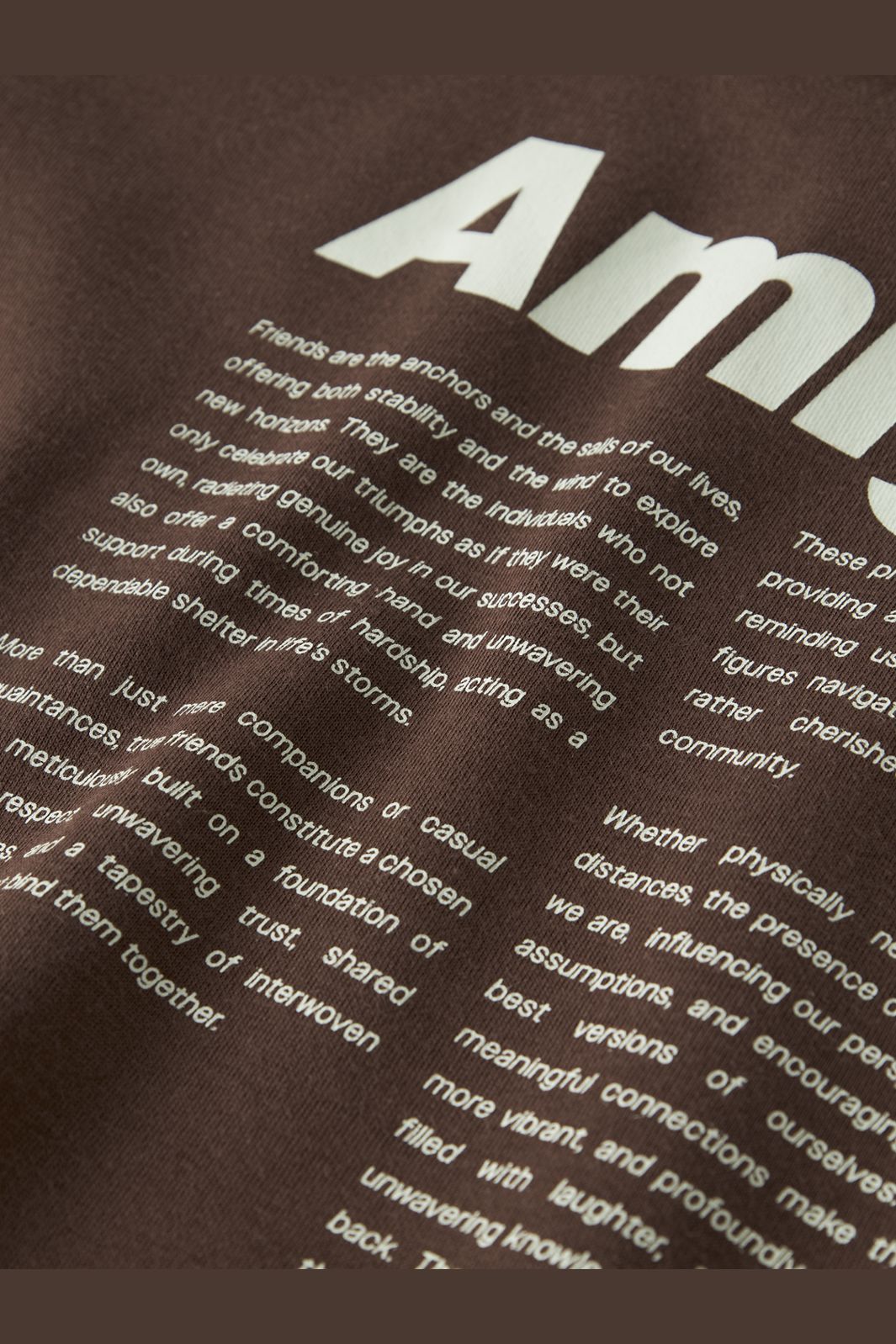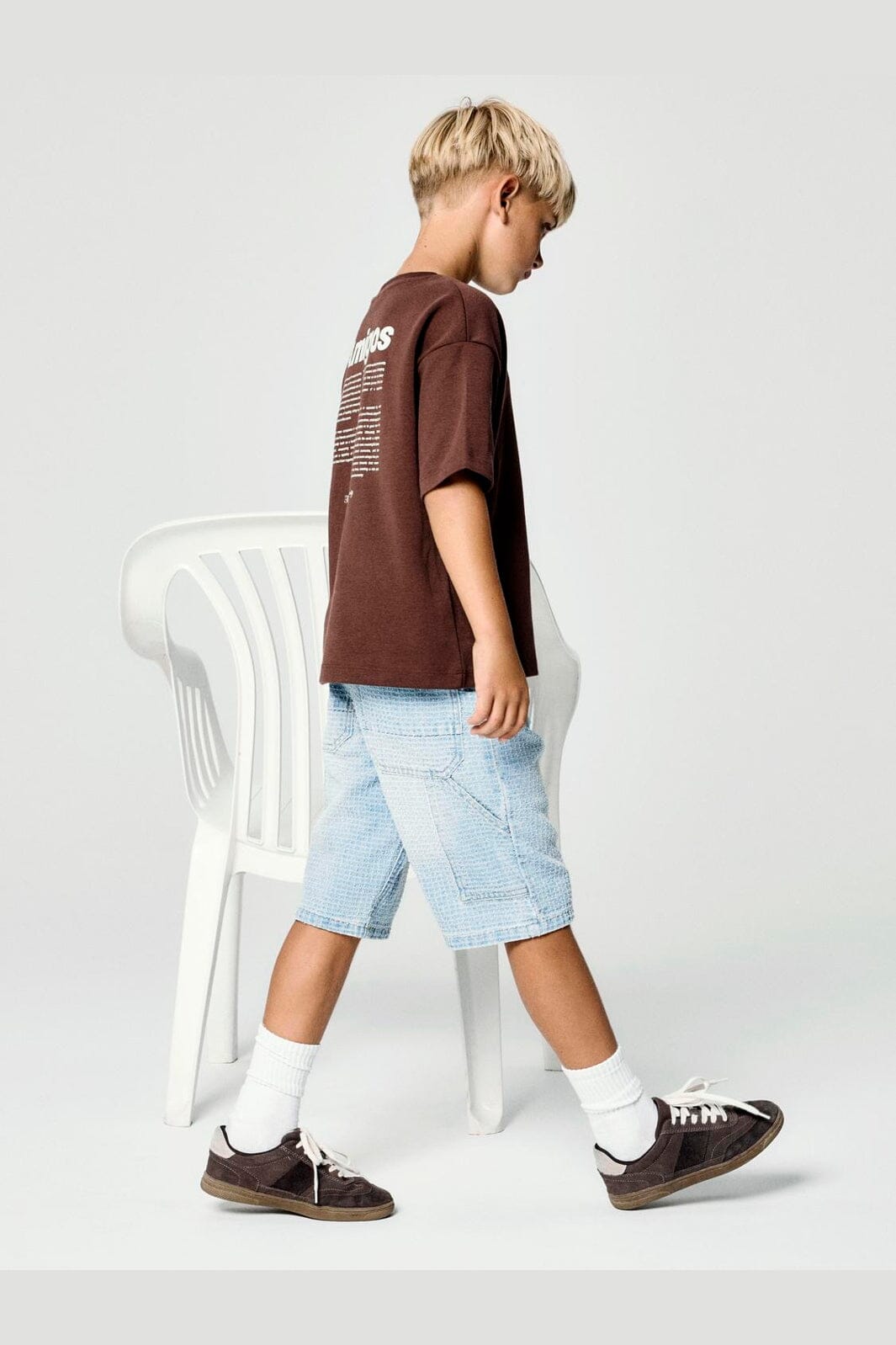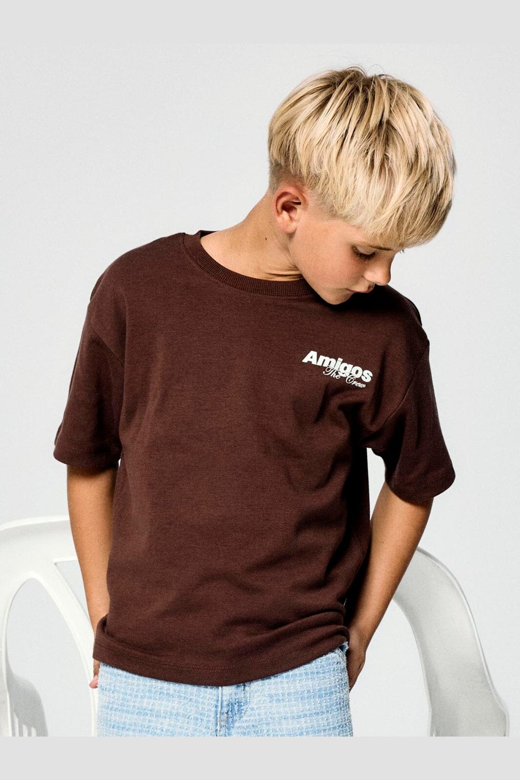 Brun t-skjorte fra Name It i en blanding av økologisk bomull og polyester. T-skjorten har en løs passform og et Amigos The Crew-print på forsiden og baksiden.