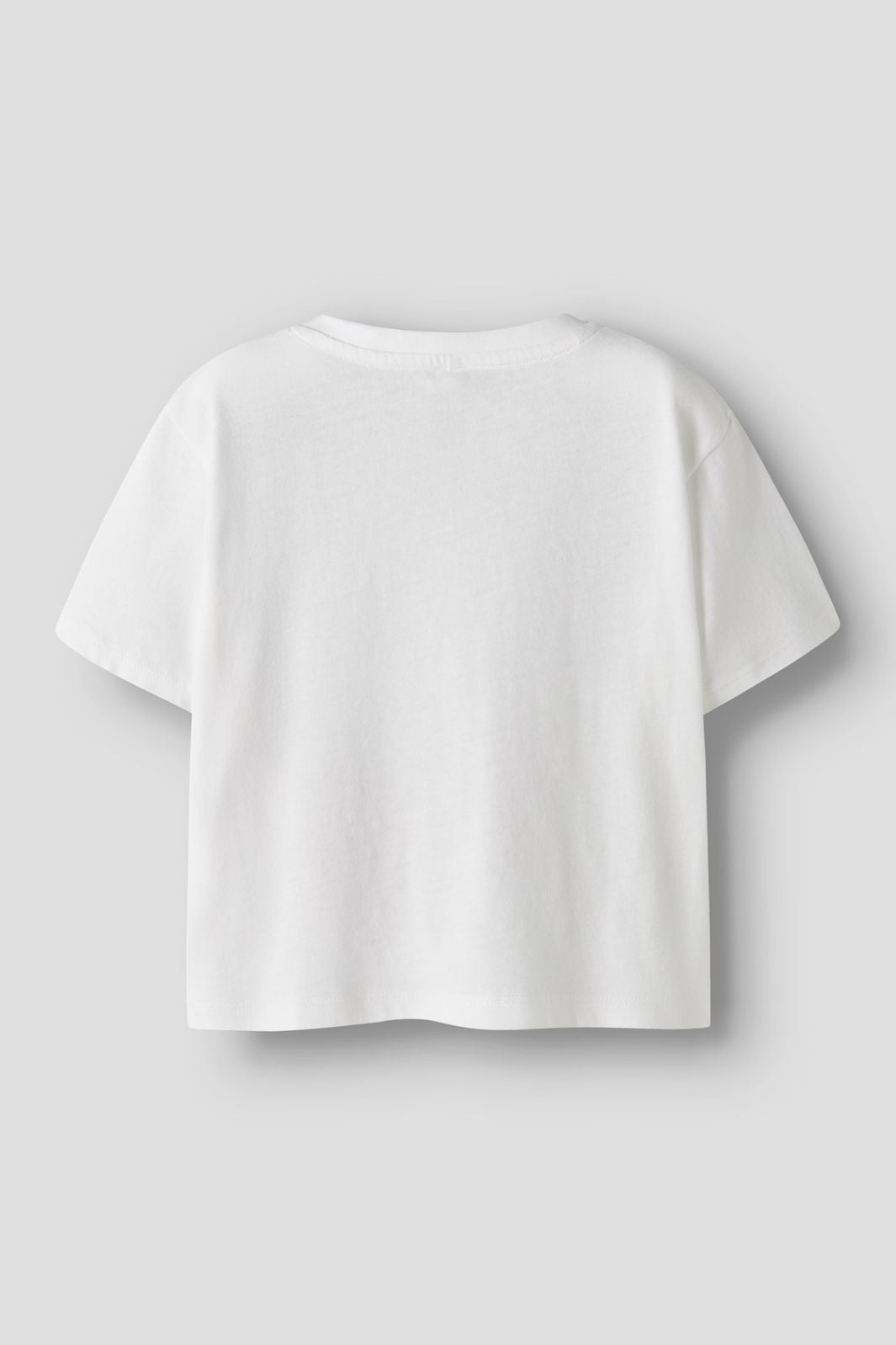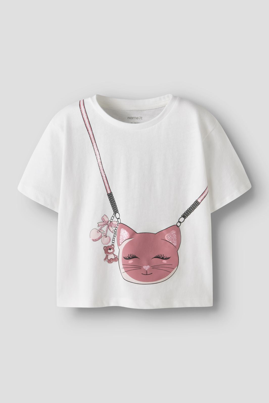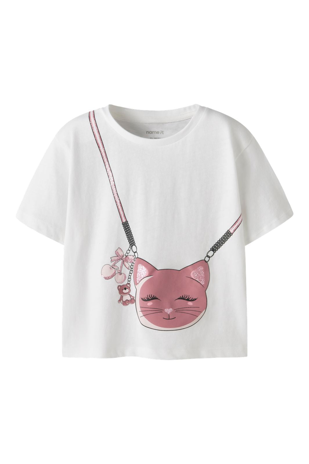 Hvit t-skjorte fra Name It med et trykk av en rosa katt. T-skjorten har rund hals og korte ermer. Trykket har glitrende detaljer på katten og en liten bamse ved siden av.