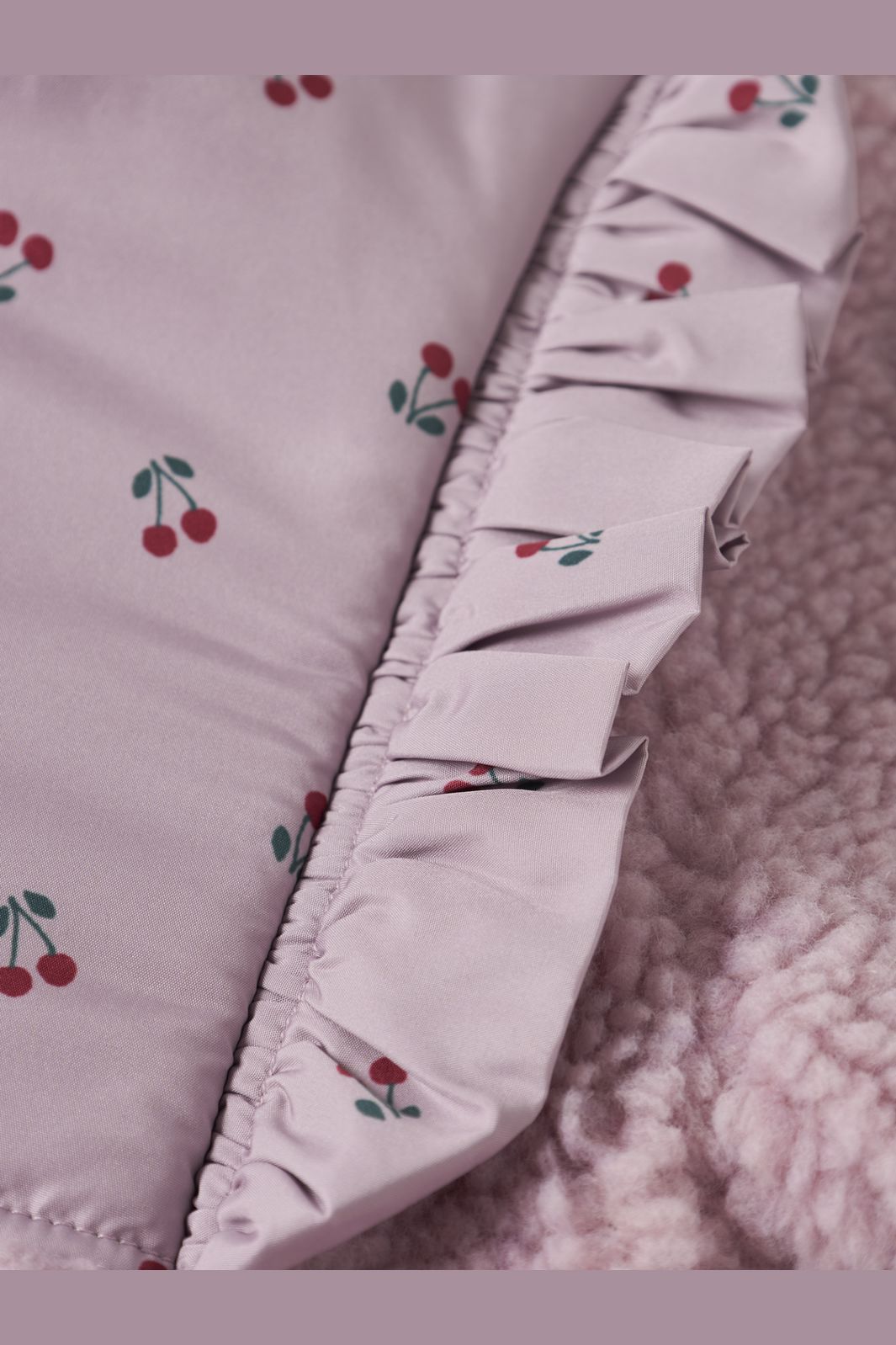 Teddykåpe fra Name It i en rosa-lilla nyanse med en myk, fluffy overflate. Kåpen har en høy krage og kirsebærmønster på den øverste delen.