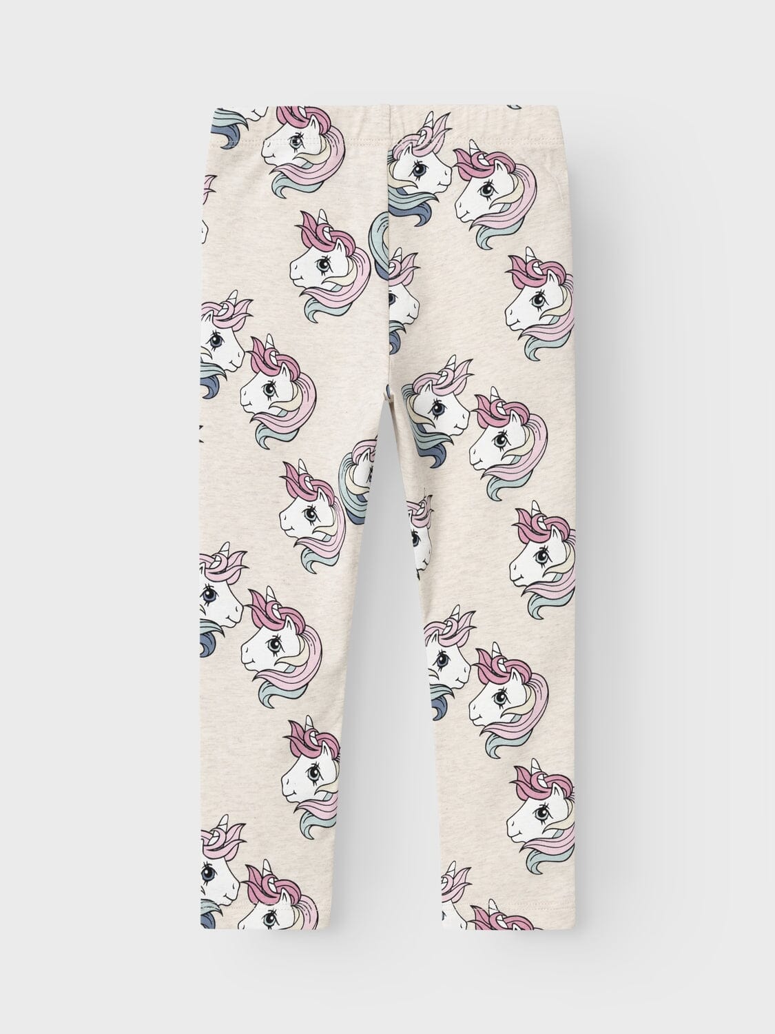 Beige leggings fra Name It med enhjørningsprint. Mønsteret består av gjentatte enhjørninger i lyseblå og rosa nyanser på en lys bakgrunn.