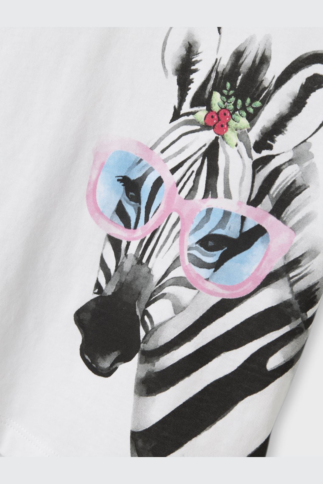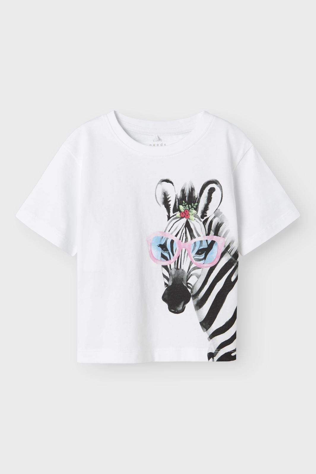 Hvit t-skjorte fra Name It med et stort zebraprint på forsiden. Zebraen har på seg rosa briller og en blomsterkrans, noe som gir t-skjorten et lekent uttrykk.