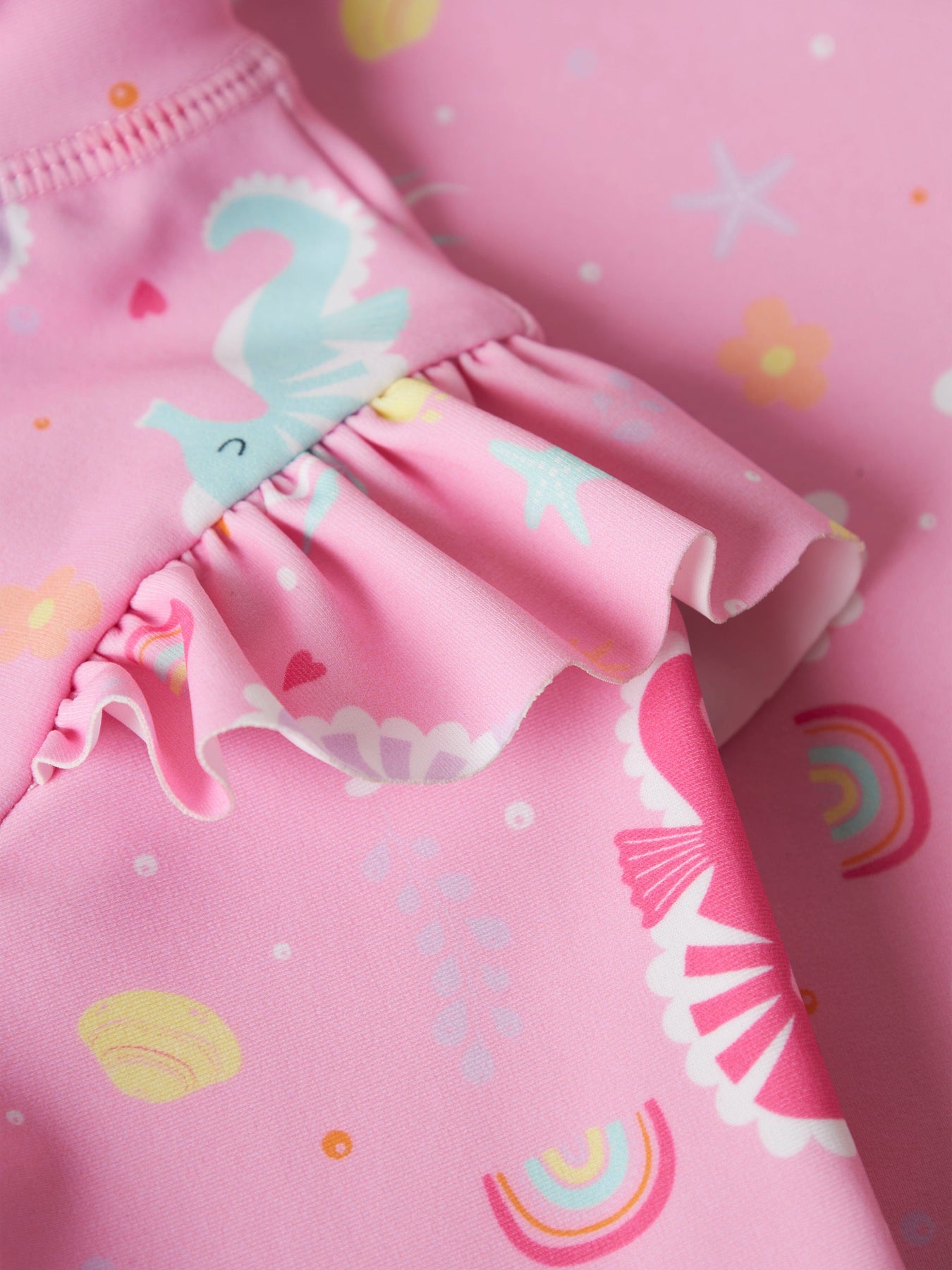 En rosa UV-badedrakt fra Name It med sjøhester og stjerneprint. De 3/4-lange ermene og UPF 50+ beskytter mot både UVA- og UVB-stråler under lek i vannet.