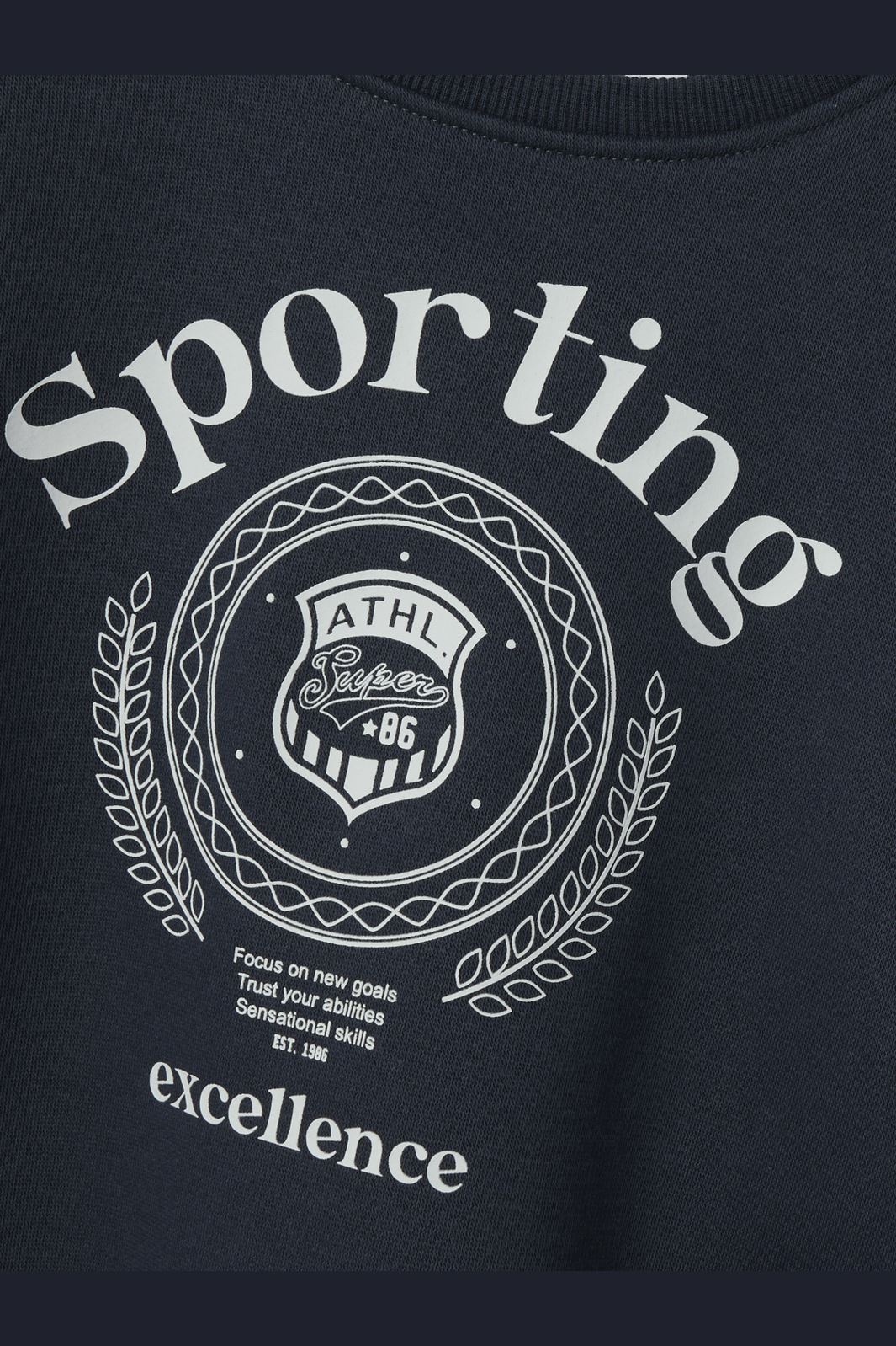 Mørkeblå sweatshirt med pigmenttrykk fra Name It. Den runde halsutskjæringen og de lange ermene gir en klassisk stil, mens det sporty trykket på forsiden skaper et lekent uttrykk.