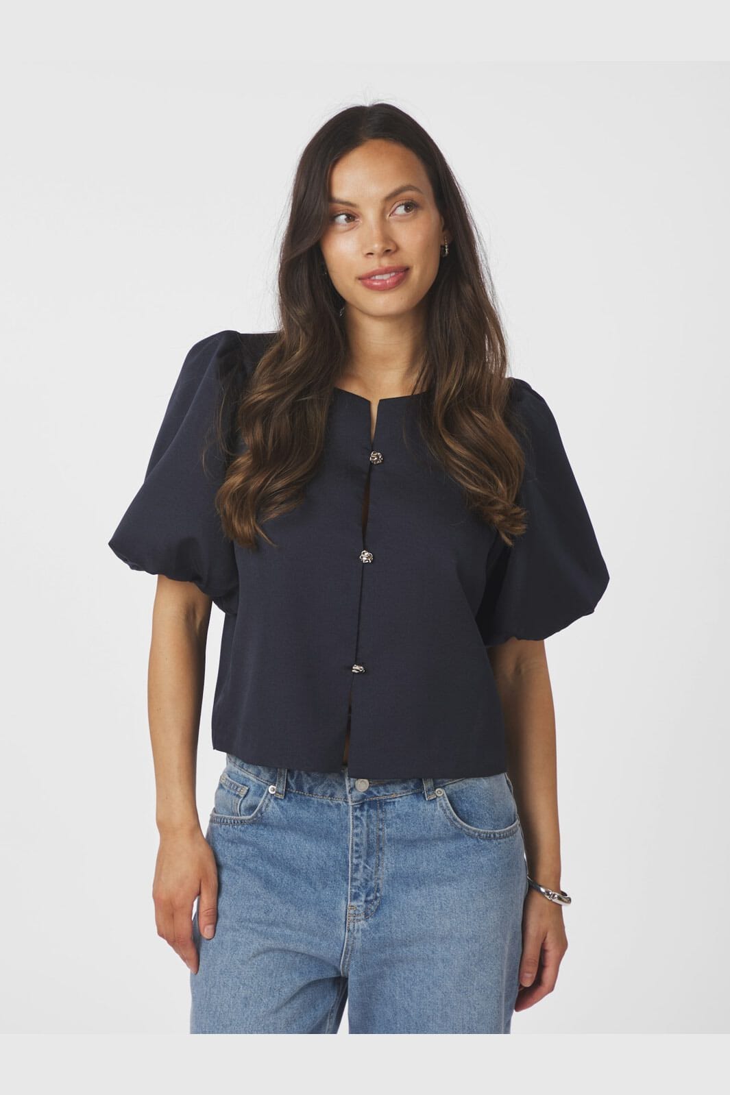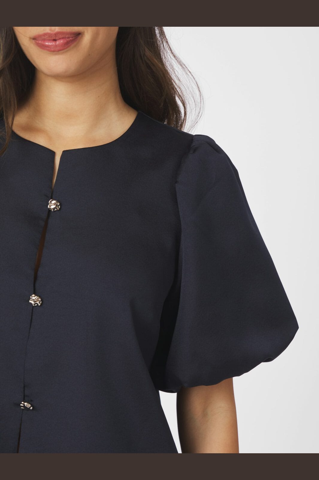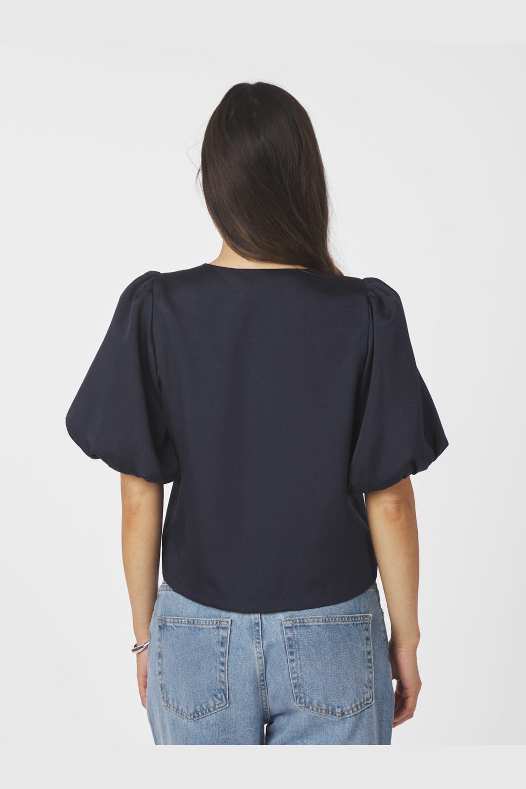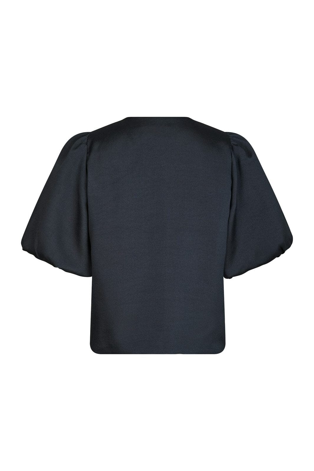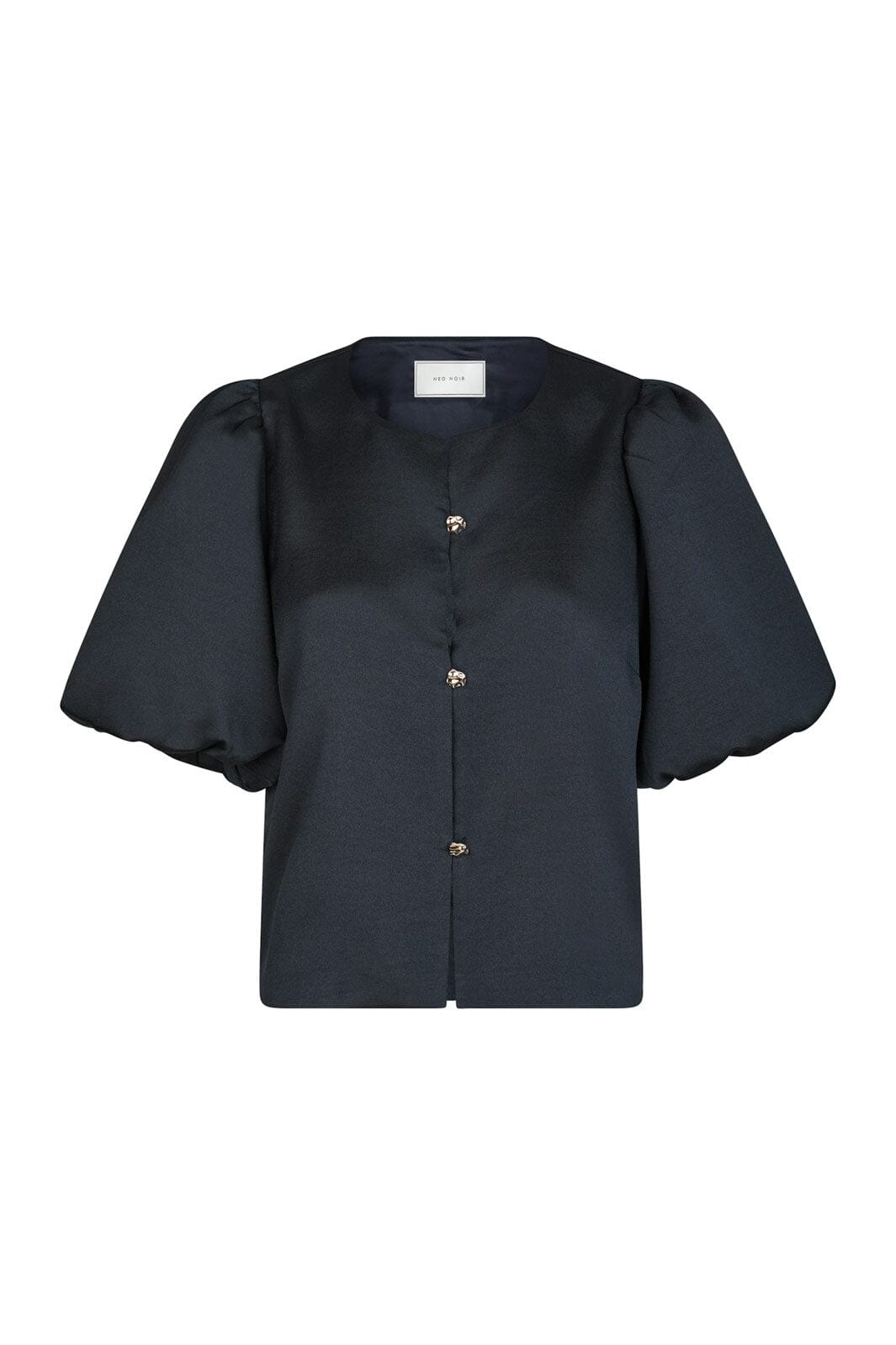 Mørkeblå satengbluse fra Neo Noir med korte puffede ermer og knappelukking. Blusen har en rund halsutskjæring og en blank overflate, som gir et lett og luftig uttrykk.