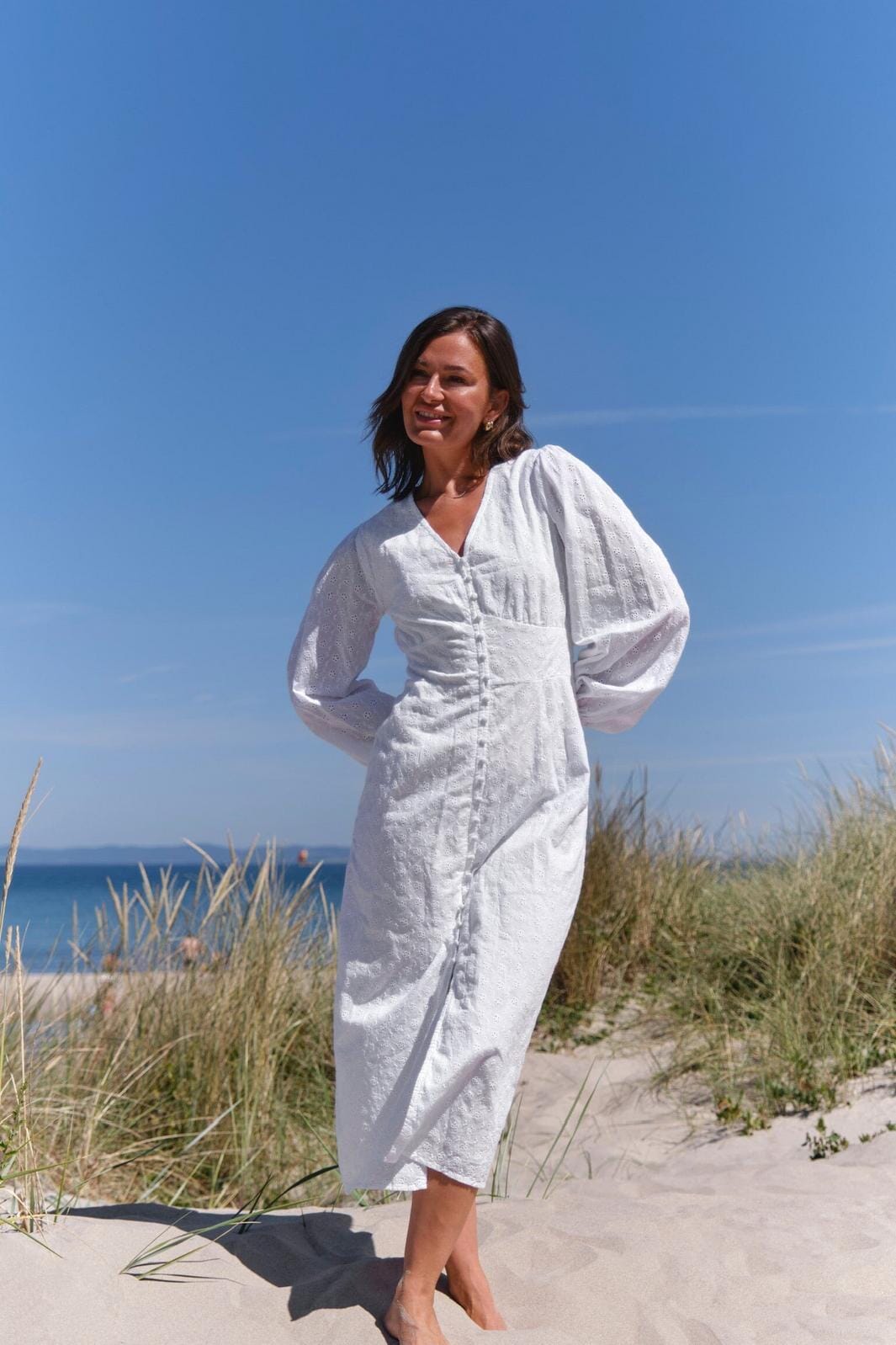 Hvit kjole fra Neo Noir i broderie anglaise-kvalitet. Kjolen har blomsterbroderi over hele stoffet, V-utringning og knapper langs fronten. De lange ermene har puff ved skuldrene.