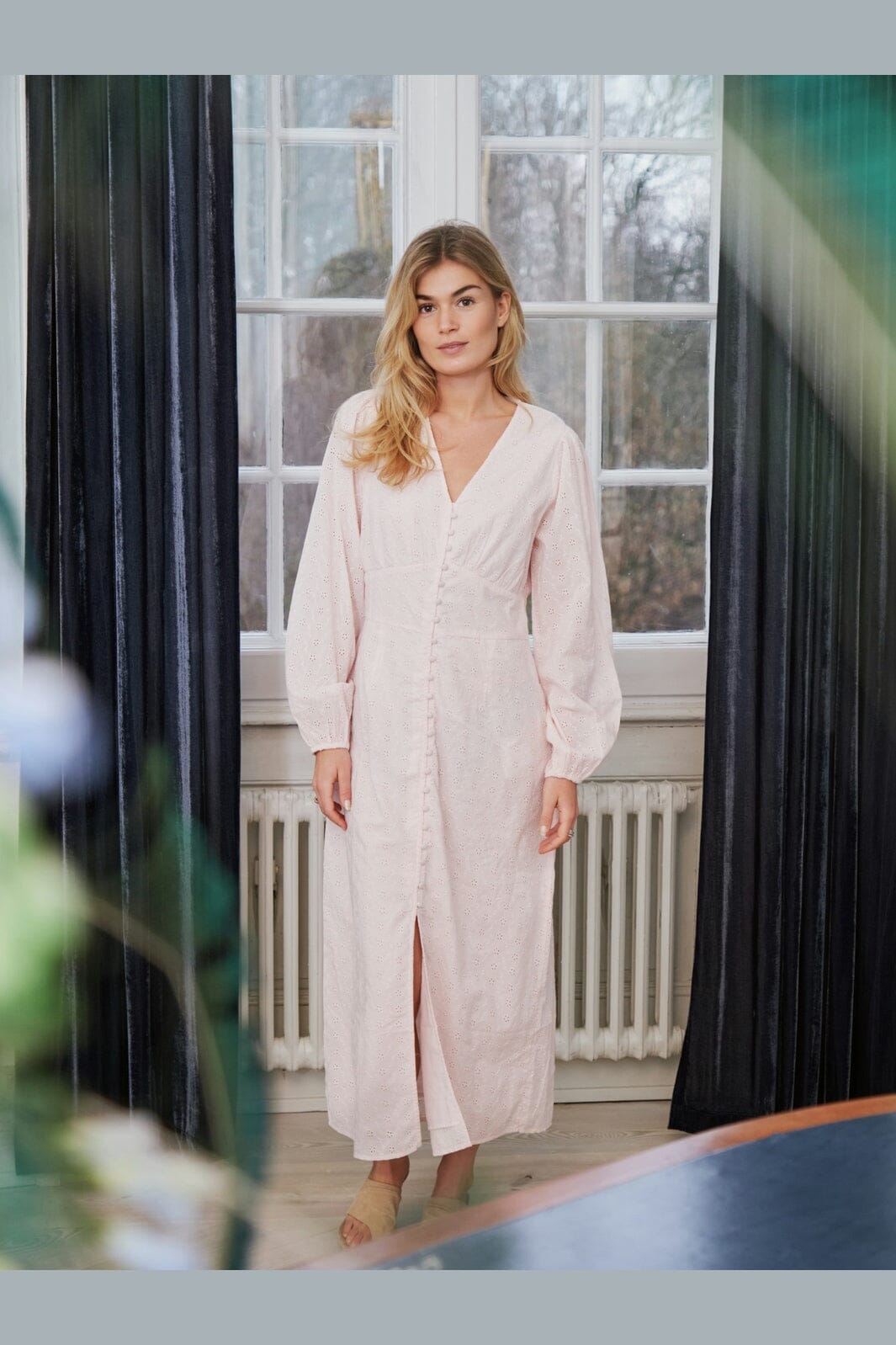 Rosa kjole fra Neo Noir, laget av 100 % bomull i broderie anglaise-kvalitet. Kjolen har et gjennomgående brodert mønster med V-utringning.