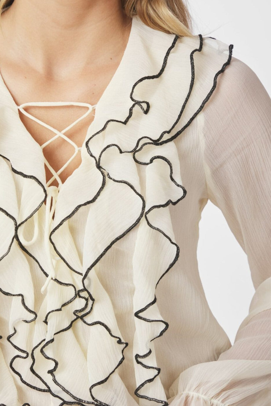 Langermet bluse med kontrastfargede volangdetaljer ved åpningen foran. Blusen kommer i en løs passform og med snørebånd foran. Modellen er 176 cm høy og har størrelse 36 på.