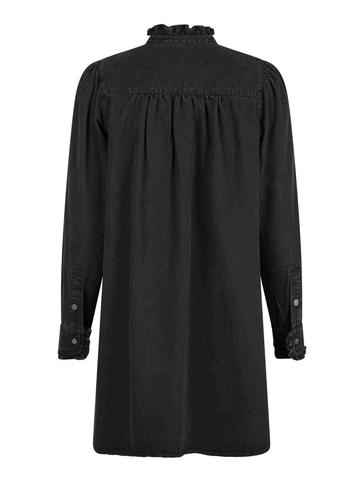 Svart denimkjole med høy hals og knappelukking foran. Kjolen har rynkede detaljer ved kragen og ermene samt en løs passform som når til midten av låret.