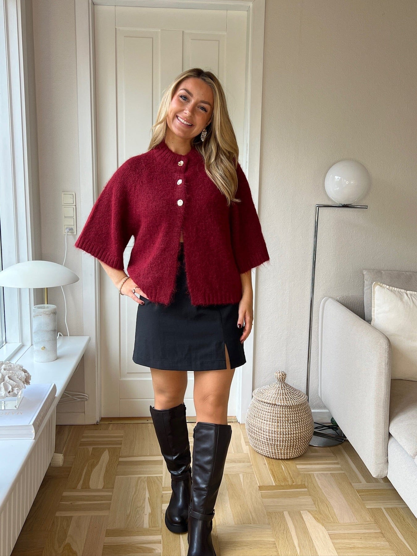 Mørkerød cardigan fra Neo Noir med fluffy strikket tekstur. Den løse passform med korte ermer og høy hals gir god bevegelsesfrihet til både hverdag og fest.