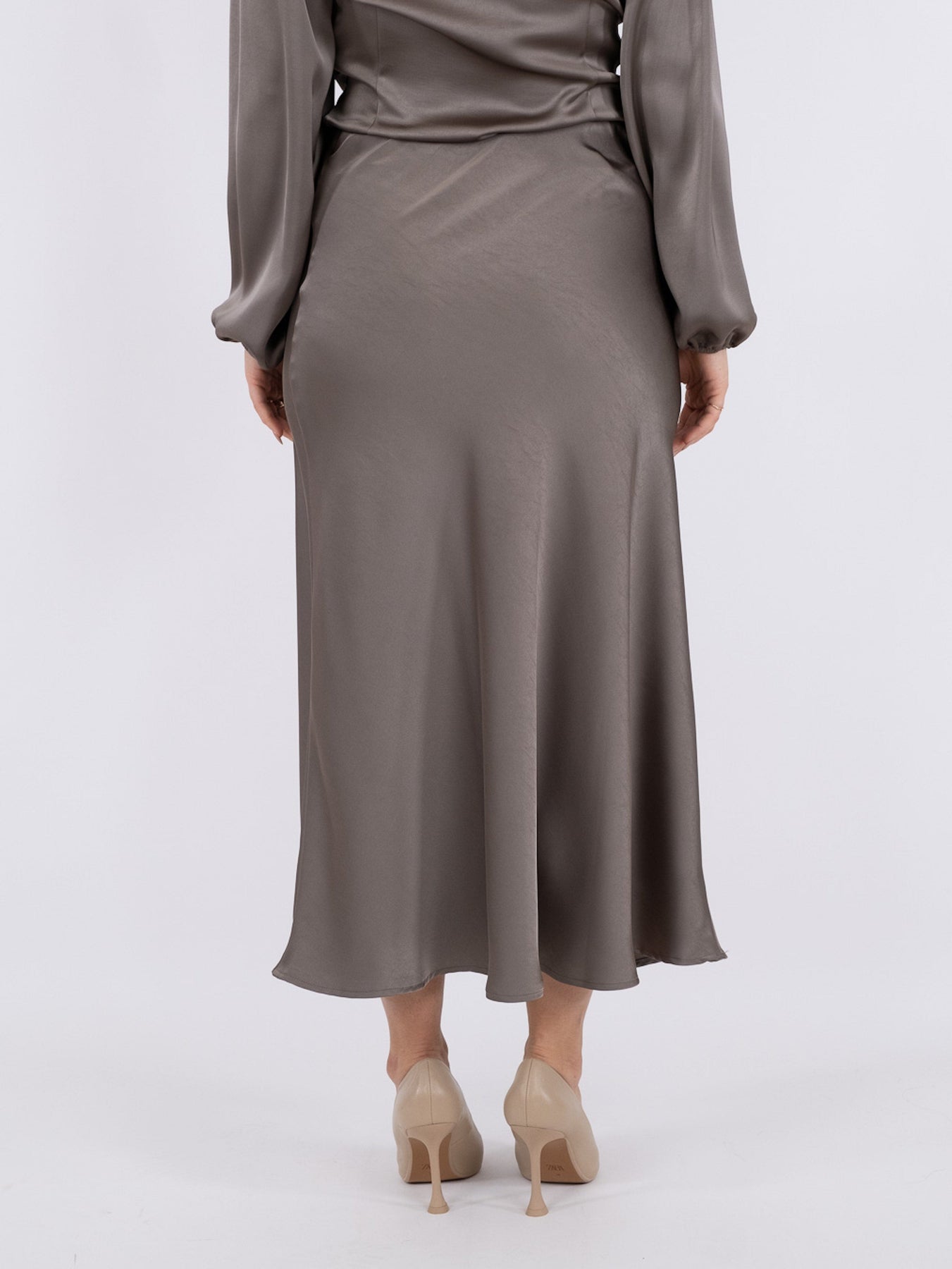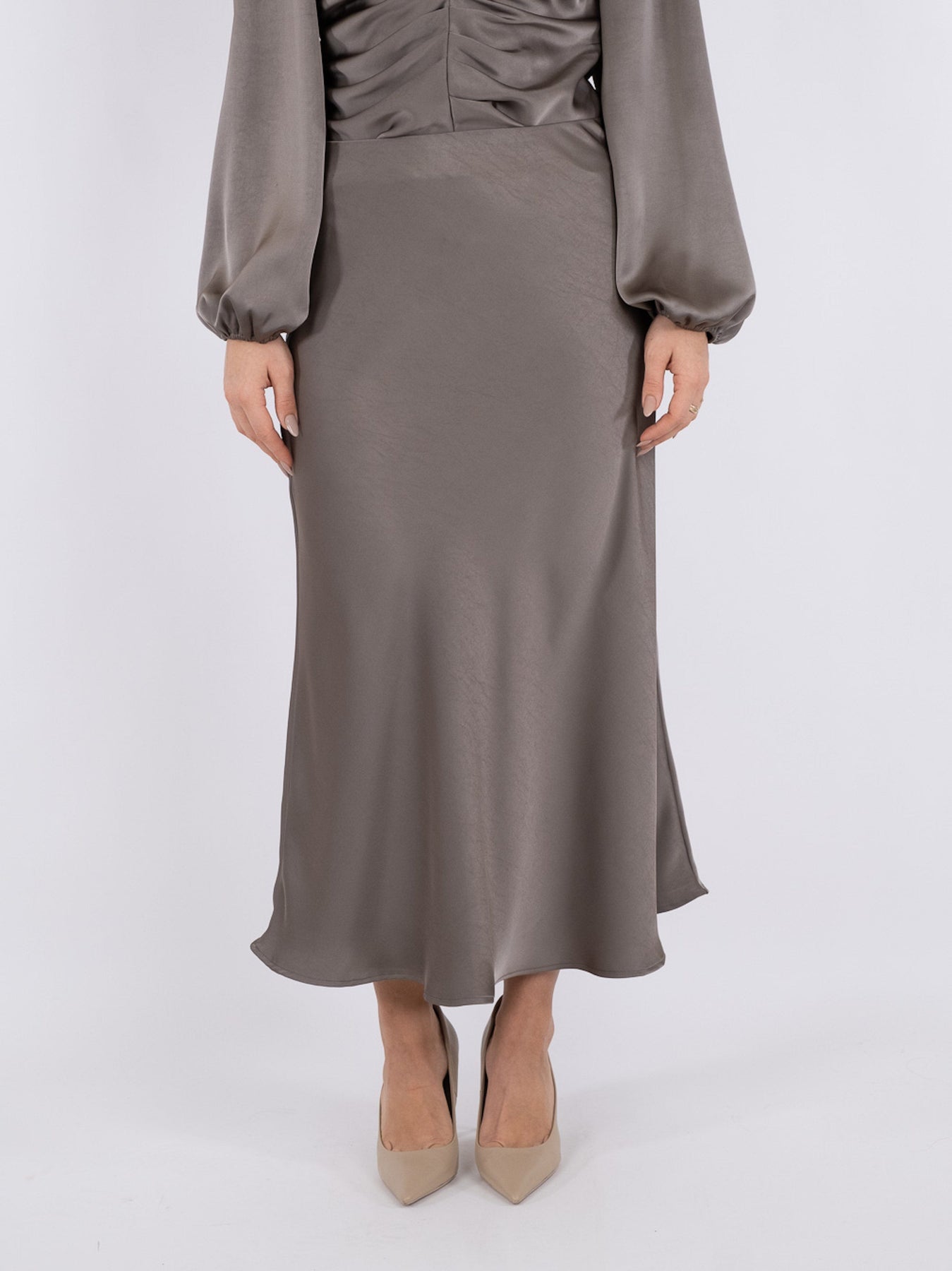 Varm grå skjørt fra Neo Noir i myk satin med skråskjæring. Den har en skinnende overflate og går til midten av leggen.