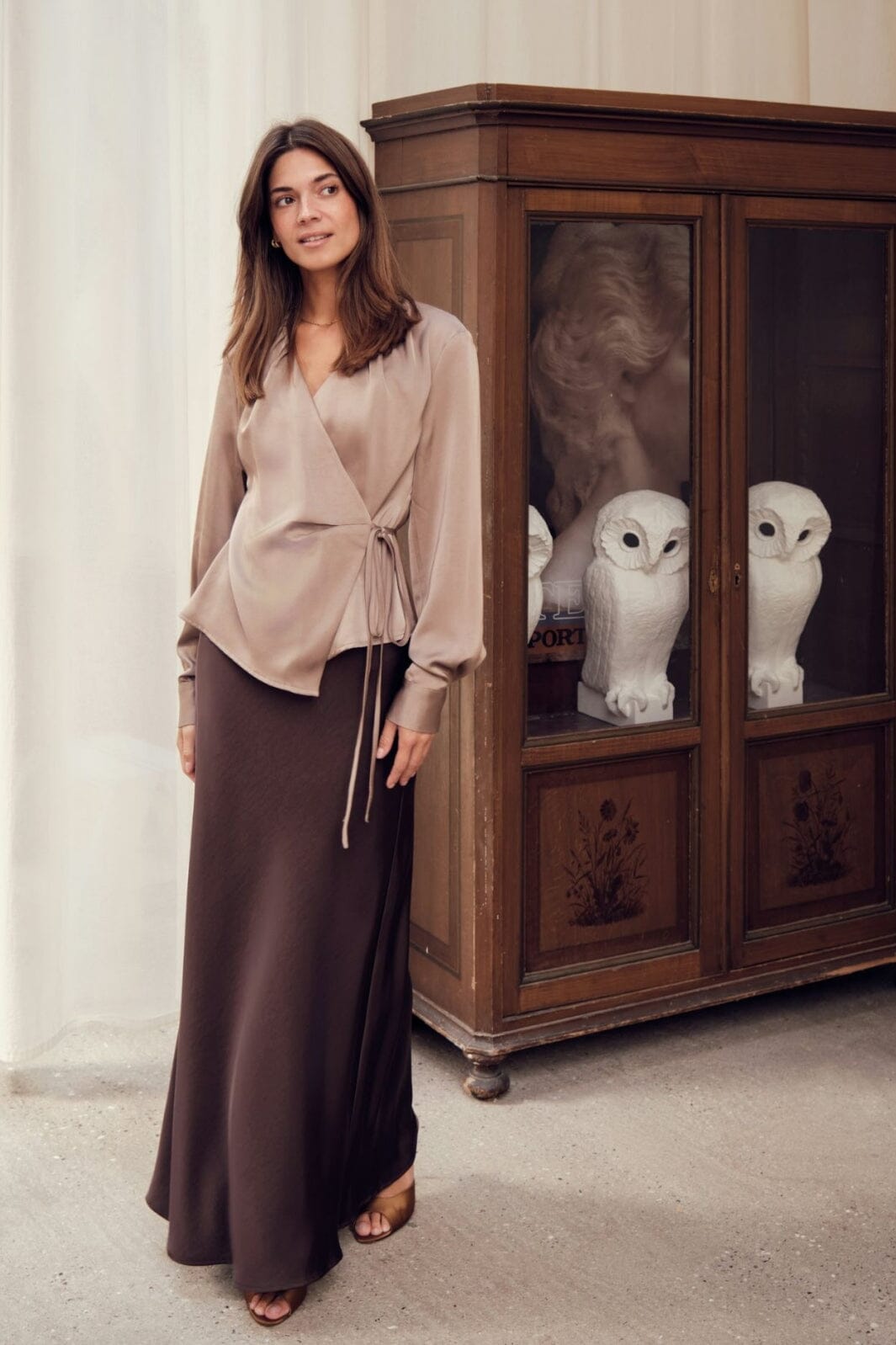 Satinbluse fra Neo Noir i mørk taupe. Blusen har en løs passform med omslagsdesign og knytebånd i siden.