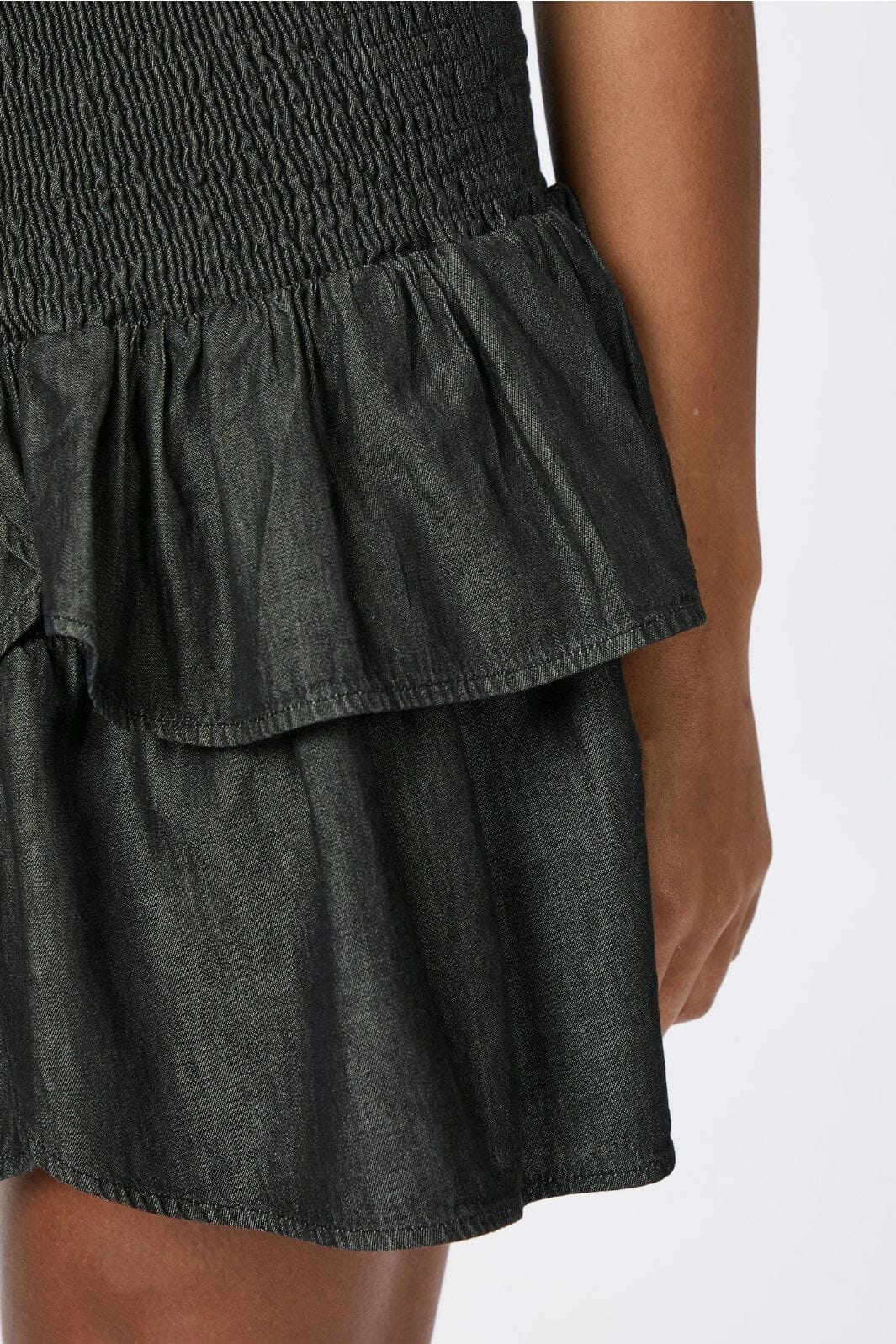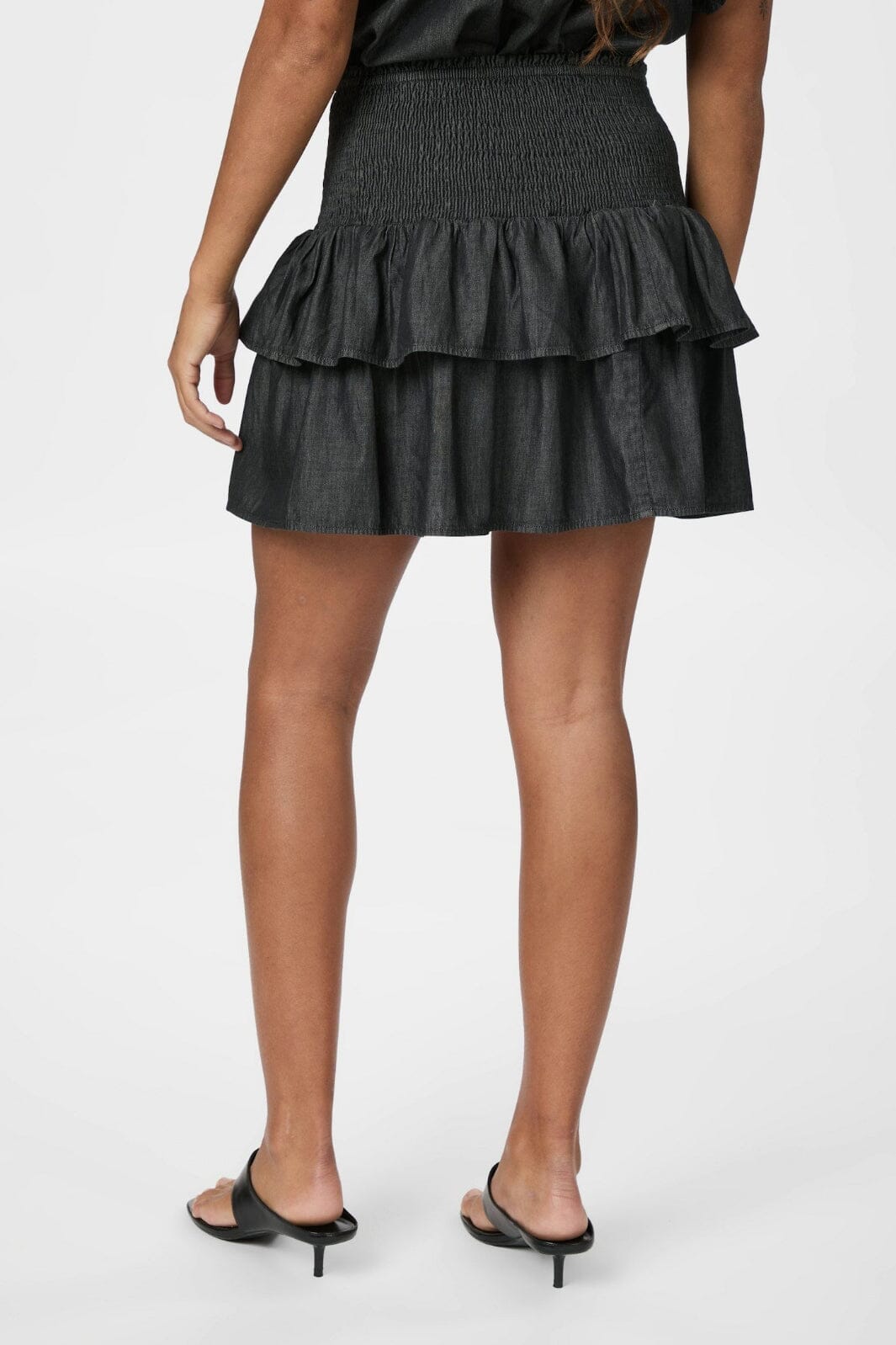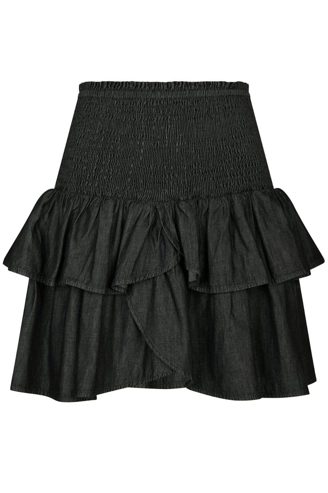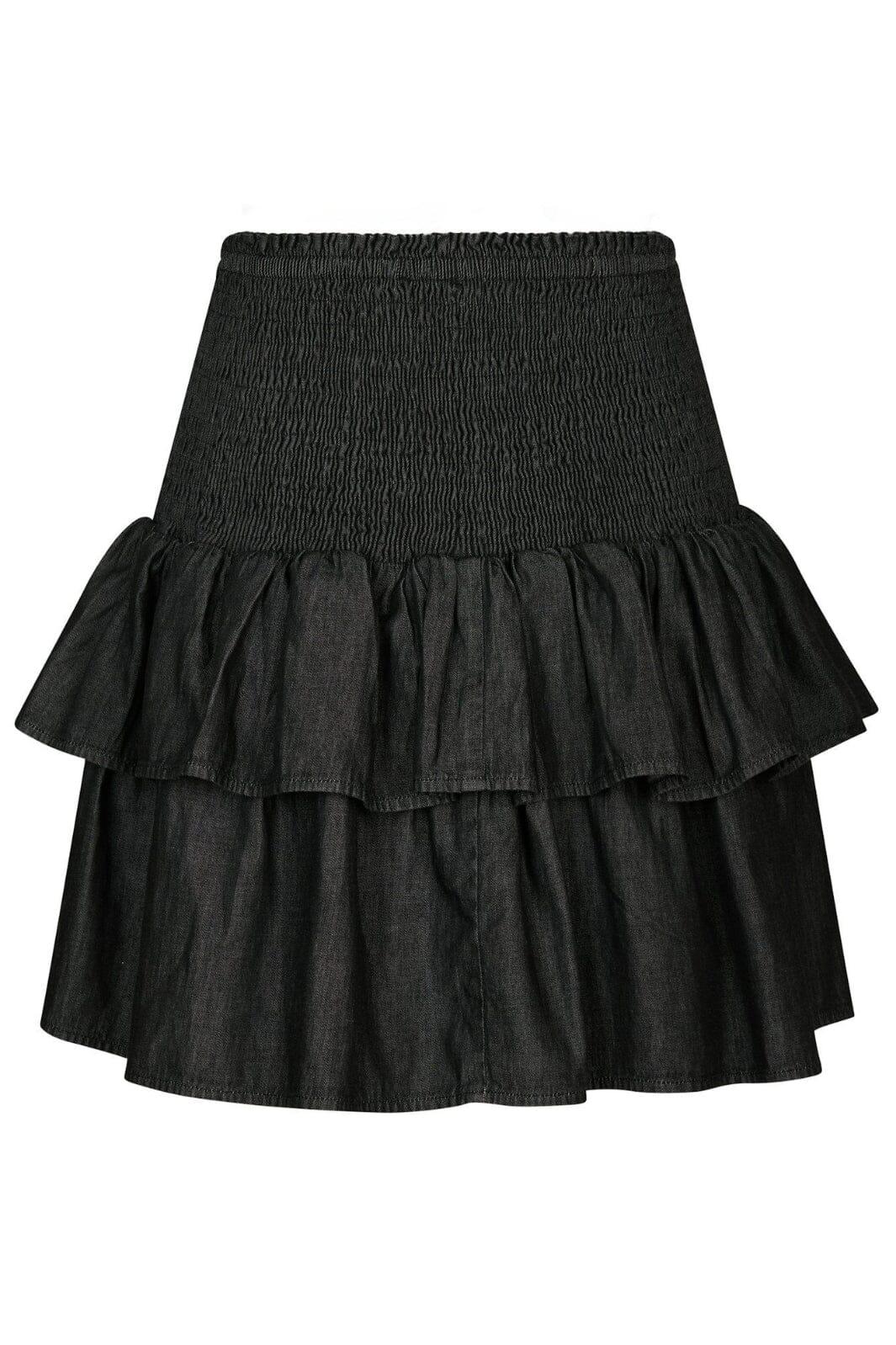 Svar denimskjørt fra Neo Noir med to lag volanger og smock-elastikk i livet. Skjørtet har en løs passform og går til midten av låret.