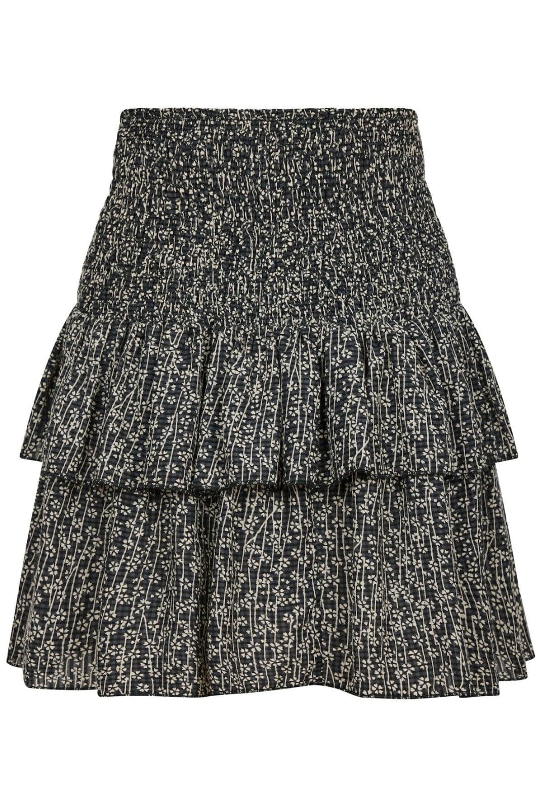 Svarte skjørt fra Neo Noir med blomster- og rutete mønster. Den smockede midjen og volanger i lag skaper en lett og bevegelig silhuett.