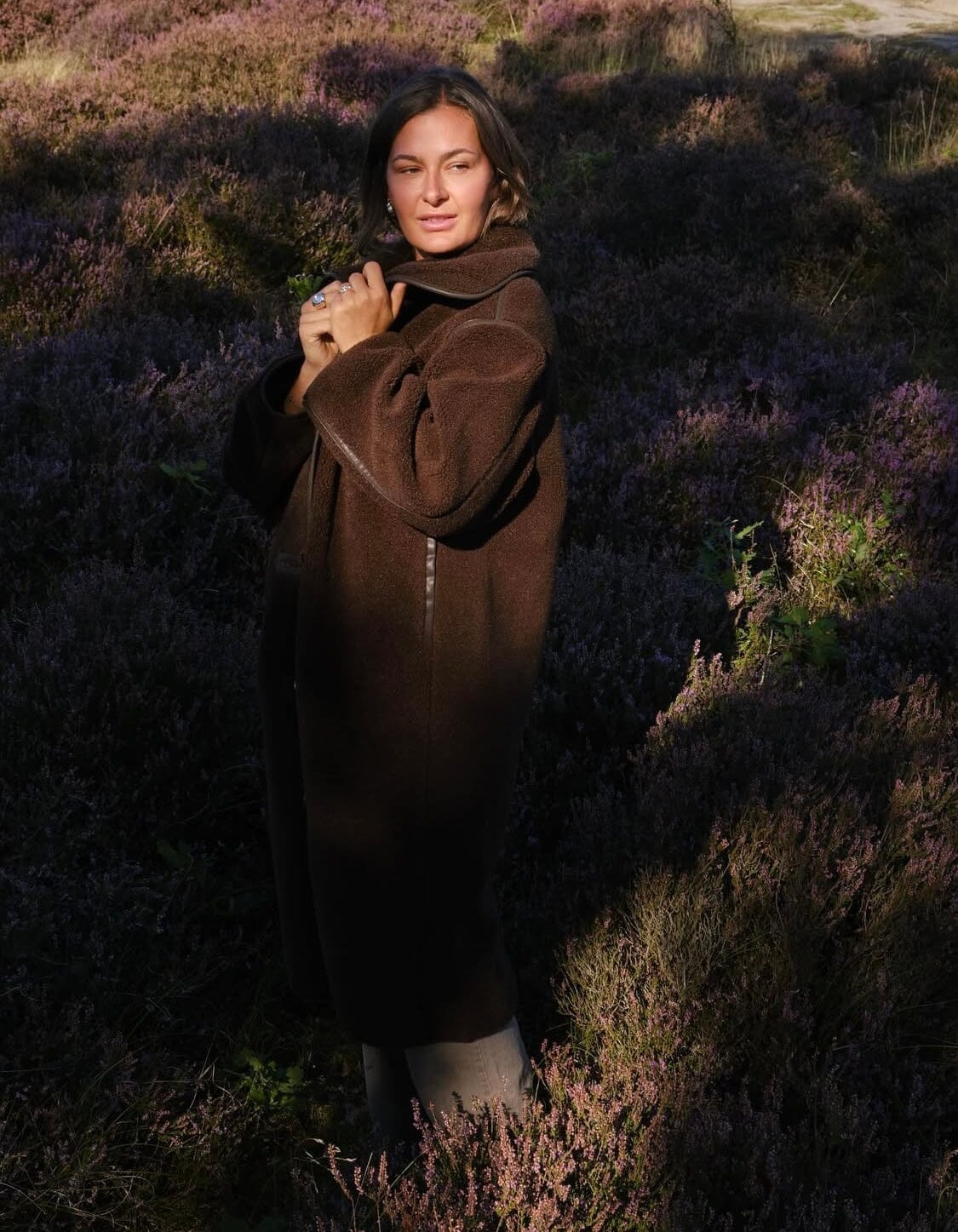 Cool loose-fit frakk i teddy-materiale. Jakken har knappelukking og flotte faux leather-detaljer. Modellen er 176 cm og bærer en størrelse 36.