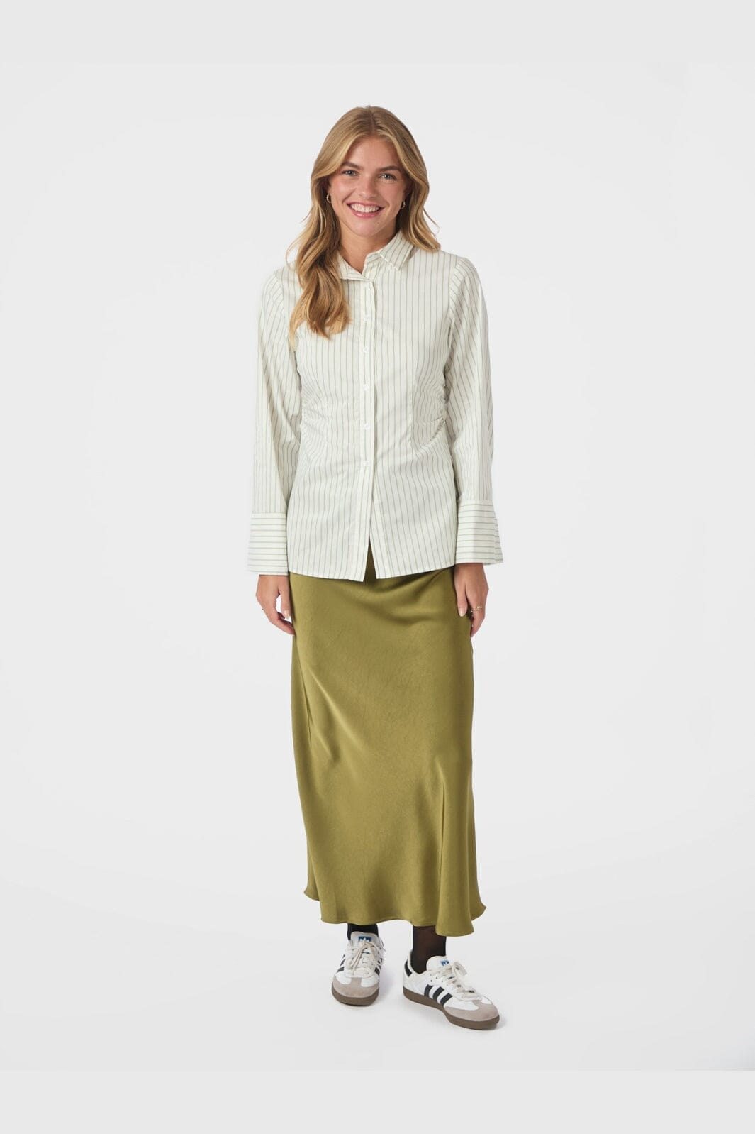 Stripete skjorte fra Neo Noir i dus grønn. Skjorten har vertikale striper i grønt og krem på en hvit bunn.