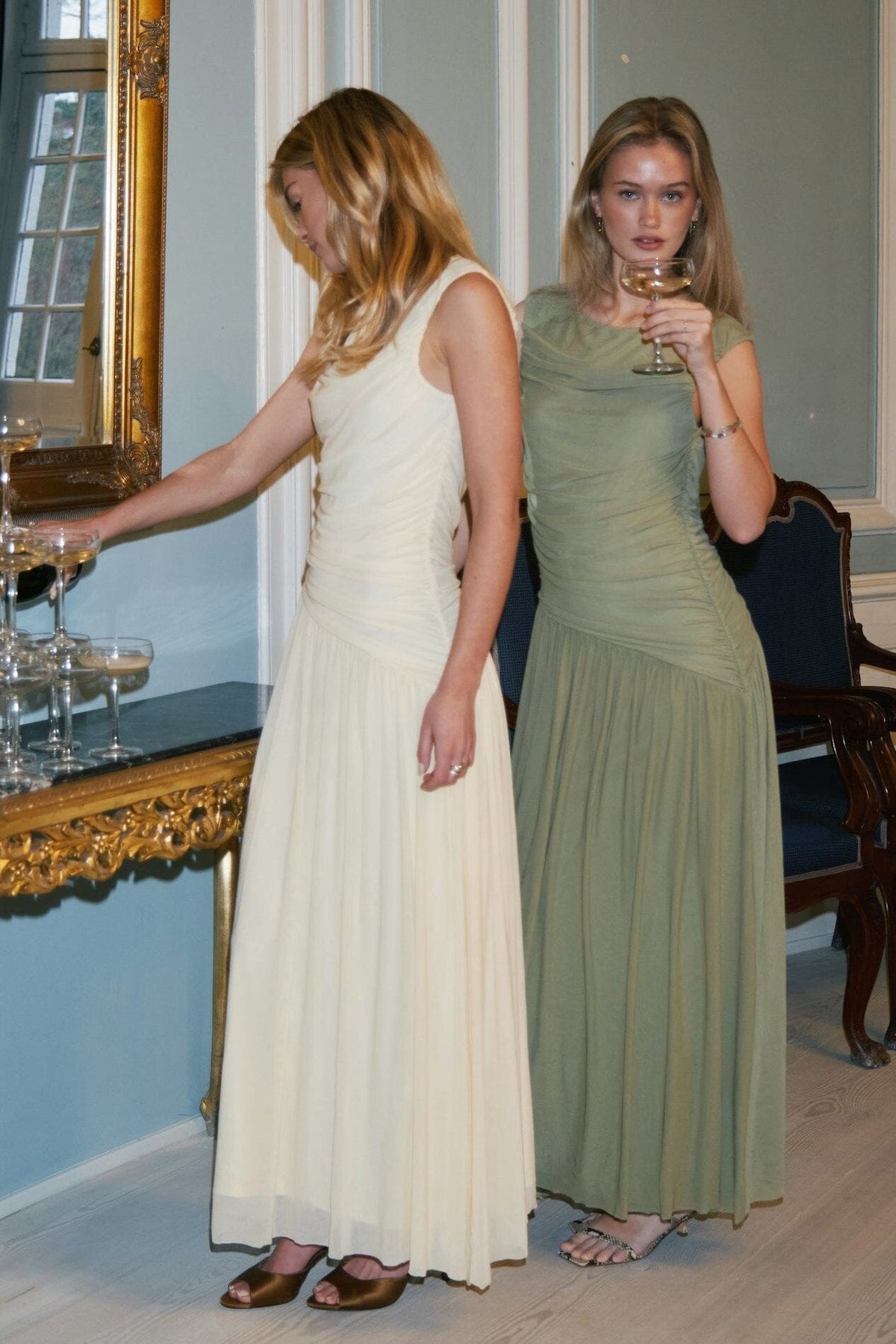 Meshkjole fra Neo Noir i en salviegrønn farge. Kjolen har rynker langs sidesømmen og en løs underkjole med asymmetrisk skåret nederdel.