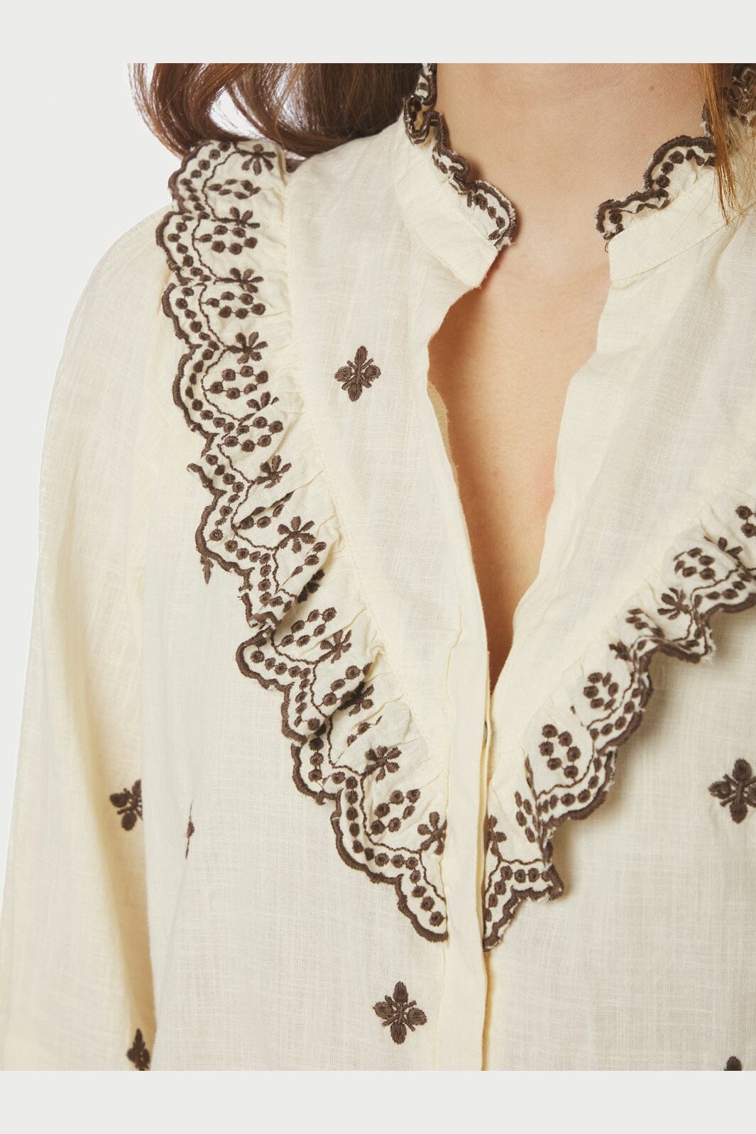 Bluse fra Neo Noir i lysegul bomull med brune broderte blomster og blondebånd langs V-halsen og mansjettene.