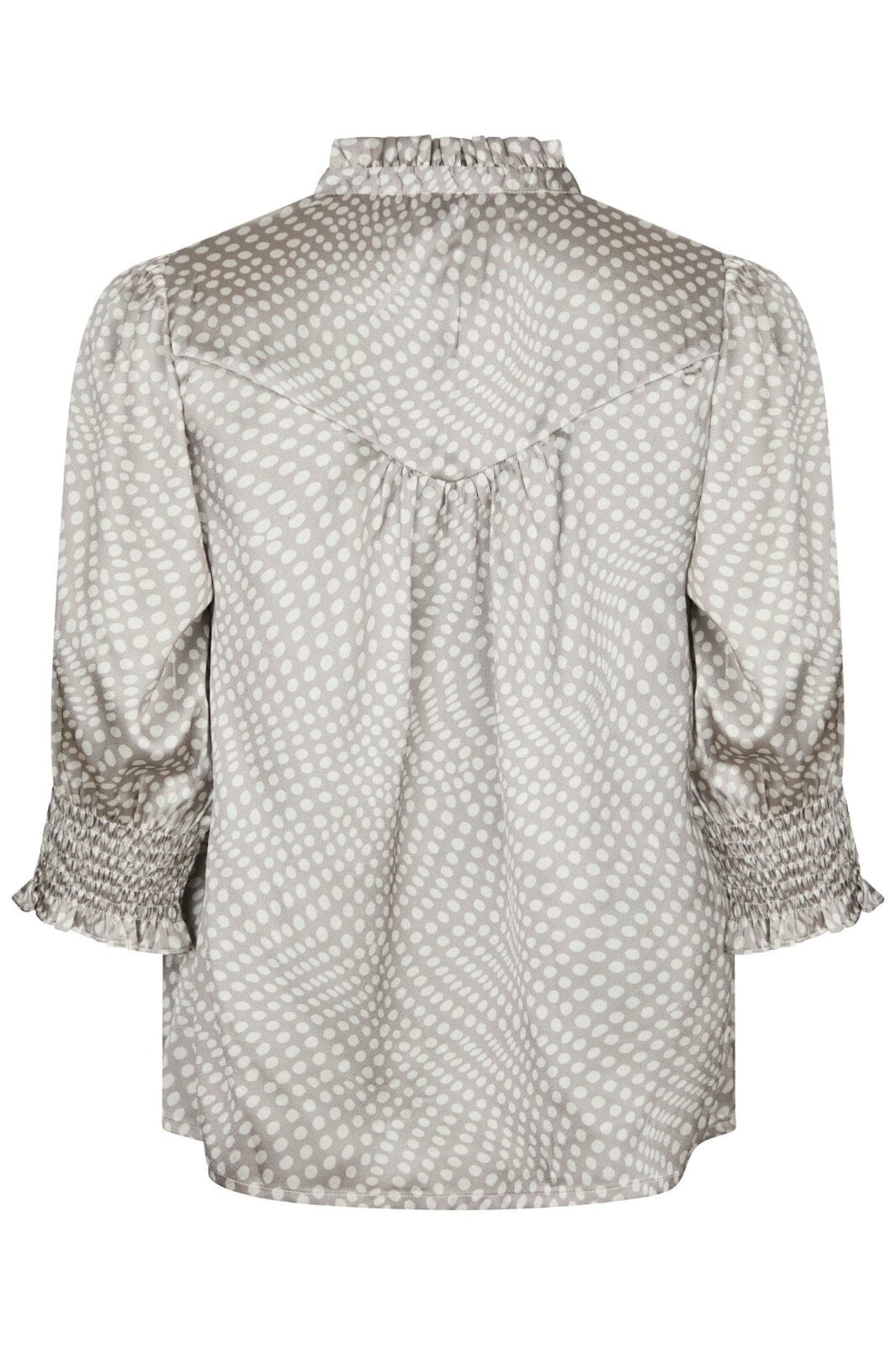 Lys taupe-bluse fra Neo Noir med hvite prikker. Blusen har v-halsutskjæring, 3/4-ermer med smock-detaljer og knapper foran.