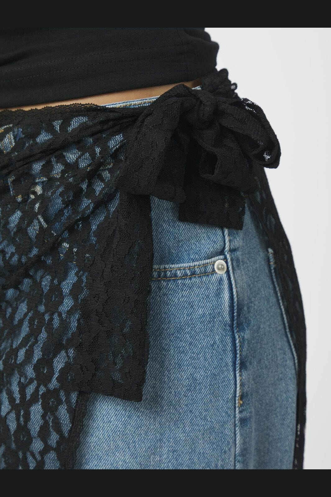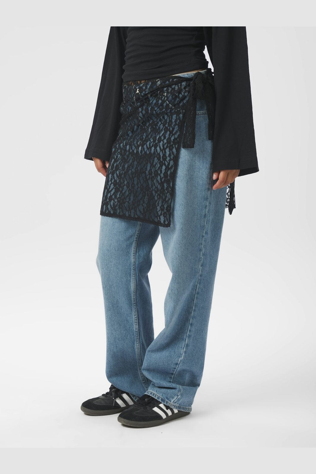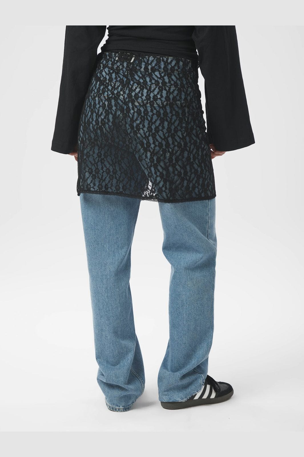 Svart omslagskjørt fra Neo Noir i blondemateriale. Skjørtet har knytebånd i siden og er designet for å bæres over bukser eller jeans for et ekstra lag.