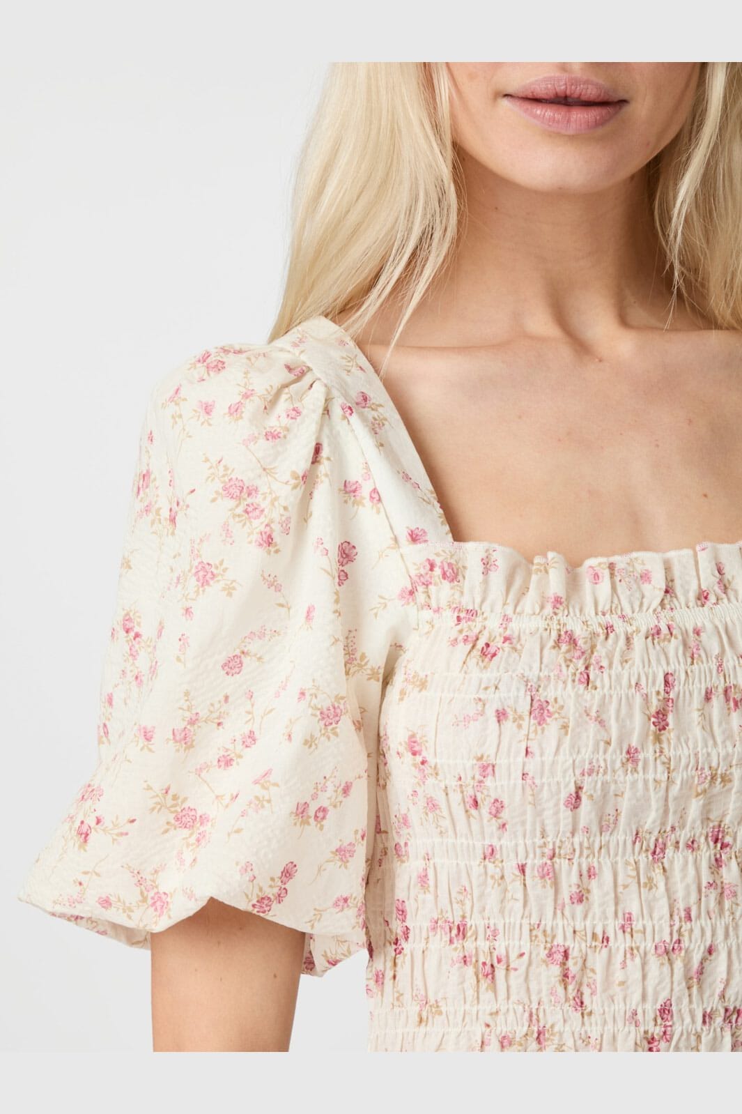 Støvet rosa kjole fra Neo Noir med blomsterprint. Kjolen har smock-detaljer over hele kroppen, pufærmer og en firkantet halsutskjæring. Den bølgede kanten nederst gir et feminint uttrykk.