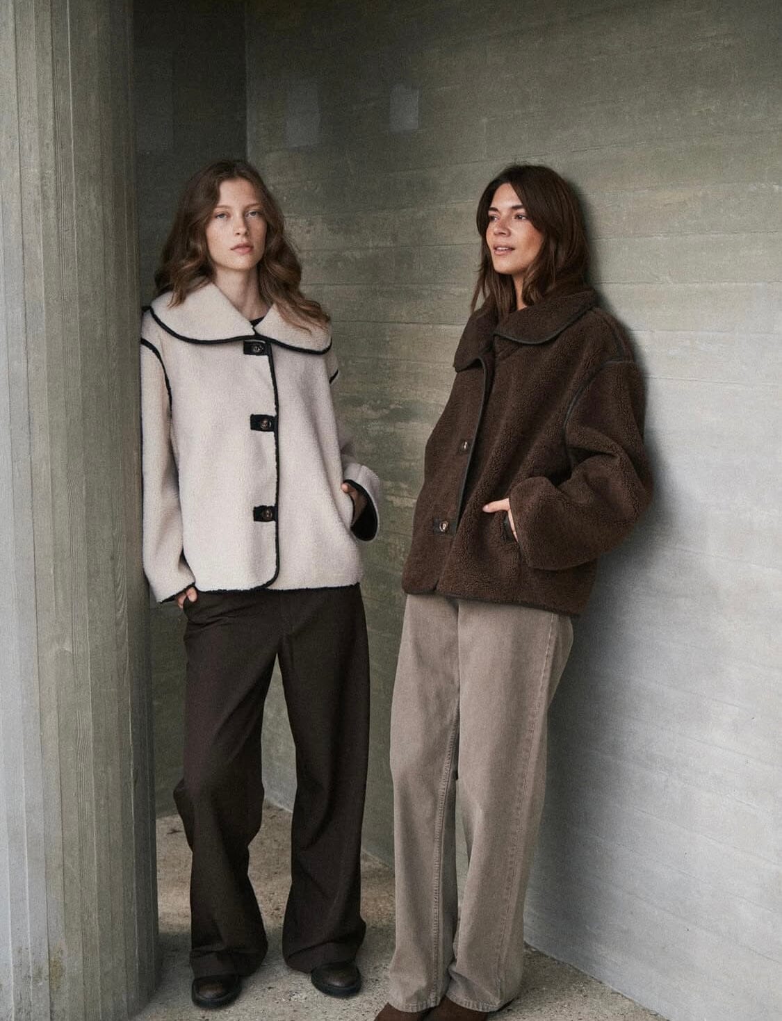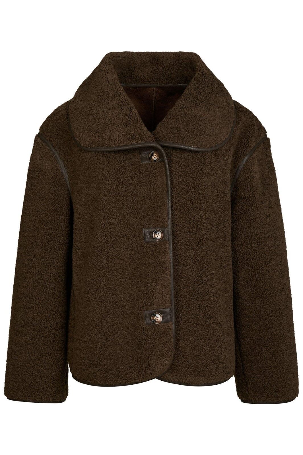 Cool kort loose-fit jakke i teddy-materiale. Jakken har knappelukking, flotte faux leather-detaljer og sidelommer. Modellen er 176 cm og bærer en størrelse 36.