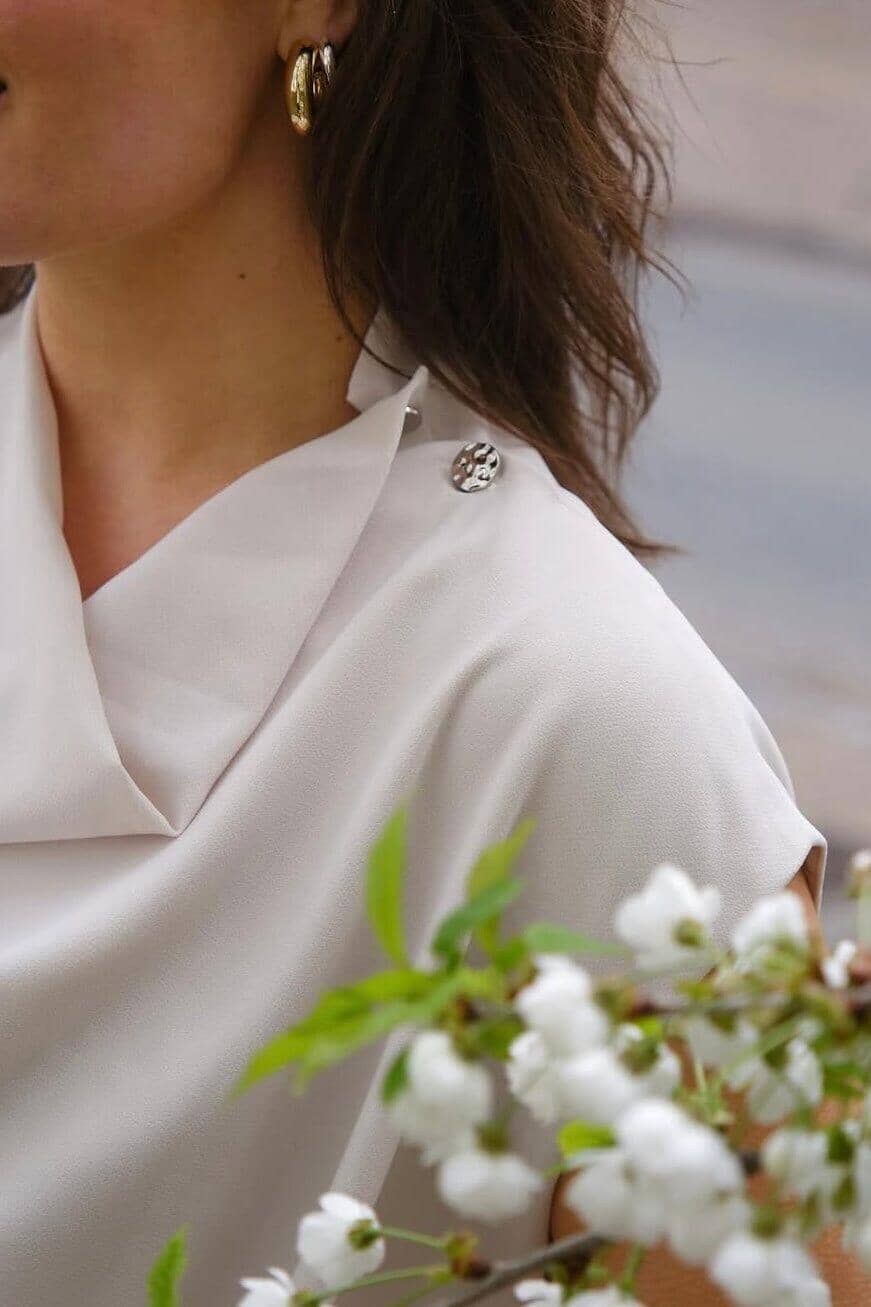 Bluse fra Neo Noir i ivory med cowl-halsutskjæring. Den har en løs passform og dekorative knapper på skulderen som gir den et særpreg.