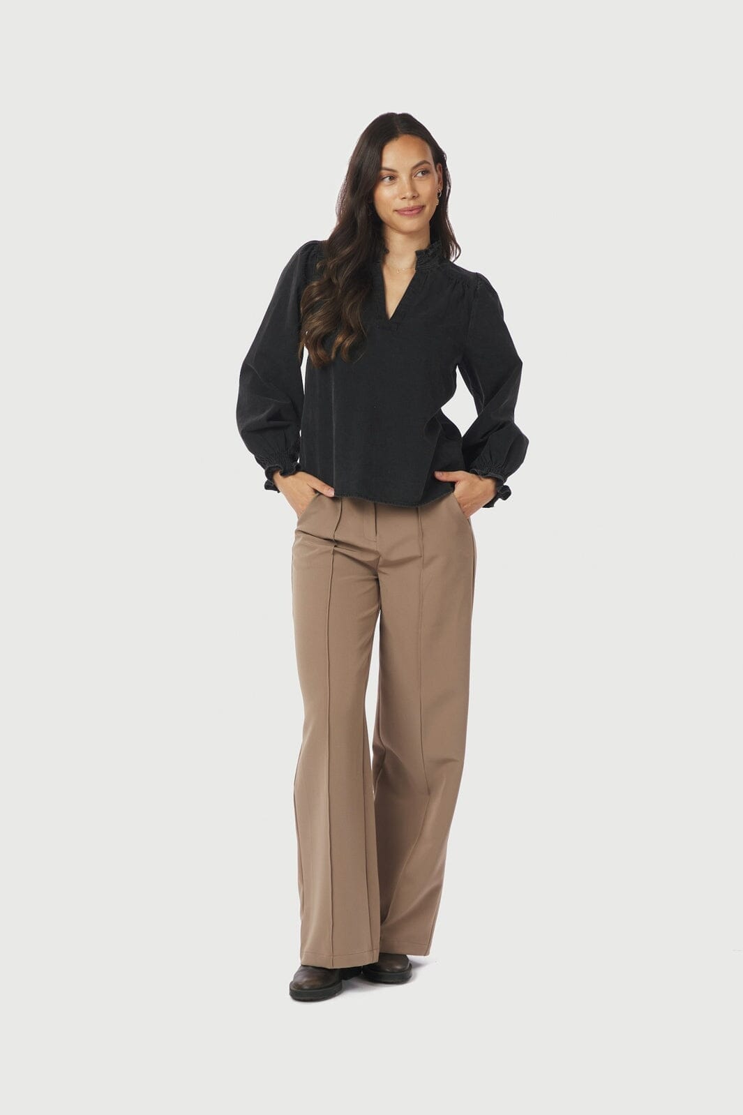 Svart denimbluse fra Neo Noir med V-utringning og rynket halsutringning. Blusen har lange ermer med smock ved mansjettene og en knytebåndslukking foran.